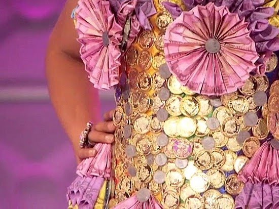 And while we agreed with Michelle that the tight hairstyle was a bad idea, calling her a pinhead seemed harsh. It’s somewhat true that Michelle wouldn’t talk to Raja that way. This is an okay look. It doesn’t really hit the money theme as hard as some of the other entries, but it’s polished and well made.