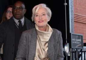 Hunh. That sounded more critical than we meant it to. She looks good. We’re probably just feeling residual irritation from looking at his preciousness. It’s not that we hate the look or that it doesn’t suit him, but it’s so … on point that it comes off like a cliche. And he’s wearing tweed in July. That’s bound to make us cranky.