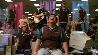 where everyone pretends that they don’t know she recently reached out to Rachel because she’s her daughter, and demands retribution. Finn and Puck (well, mostly Finn, really) promise to pay it off and get jobs. Enter Terri and Sheets n’ Things. We thought they’d forgotten about Terri. They certainly seemed to have forgotten about Emma. We realize this is a big cast and a bit of a juggling act for the creators, but still. Anyway, Jessalyn Gilsig can make us laugh just by raising her eyebrow and saying “Oh,” so we were happy to see the return of her and her hilariously named work place. Having the whole store sing Beck’s “Loser” was a great idea. We were happy to hear a song that was less than 20 years old being sung by these supposed teenagers.
