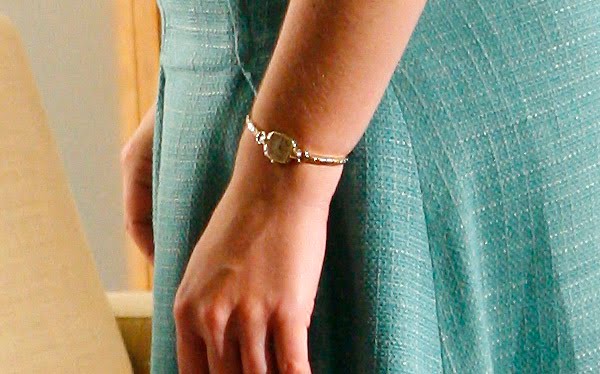 Once again, she’s in man’s world and she’s wearing a somewhat masculine gray, this time it’s set off by a feminine pink, which demonstrates how she’s straddling both worlds. This is so frumpy and ill-fitting, that it simply had to have been borrowed from her sister or mother.