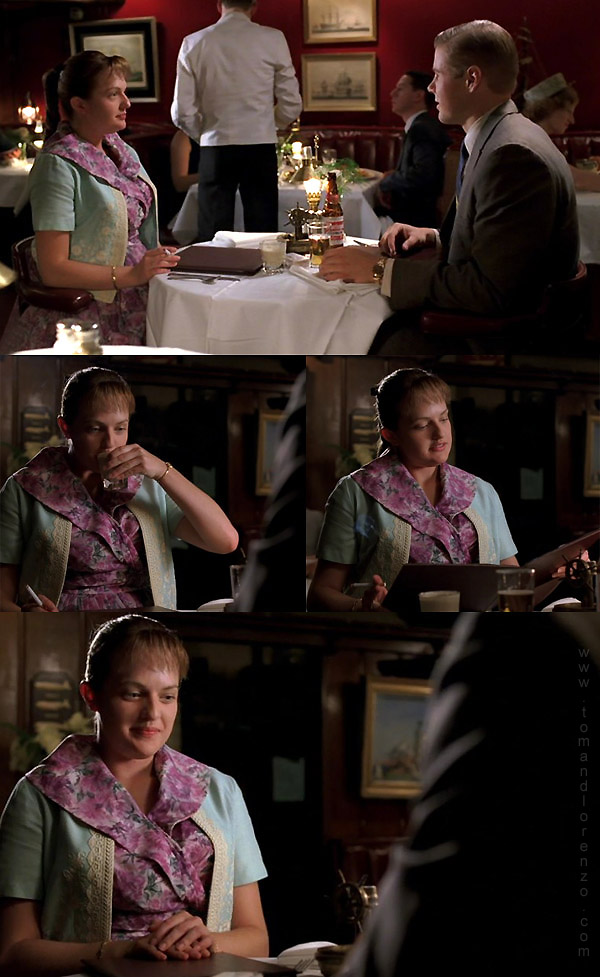 Not much to say except this outfit is TRAGICALLY ugly and dowdy. We’re even more certain that these frumpy dresses are coming from Mom and Anita. What makes it a little sad is that she tries so hard to appear sophisticated (“There’s this bar in Manhattan where they chill the glasses.”) but she just looks like what she is: a girl in clothes borrowed from her mother on an uncomfortable date. Like we said in the first Peggy installment, she never wears florals. This was a dress forced on her, just like the date was.