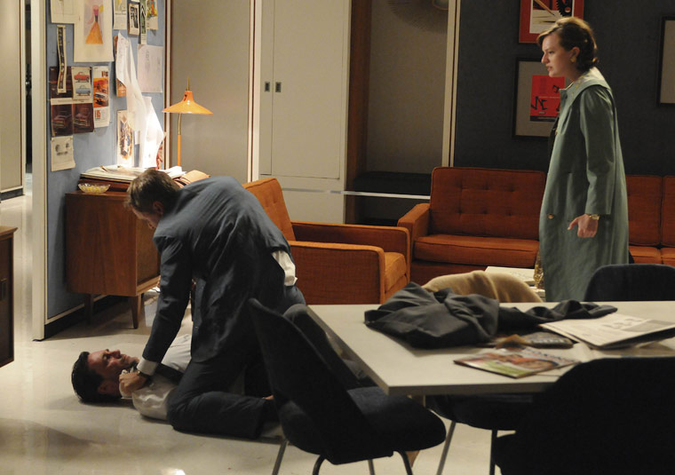 * This entire season could be packaged as a brochure for Alcoholics Anonymous. They’re not exactly being shy about how pathetic an alcoholic can become. We never really had a problem with Duck. A little slimey, sure, but we weren’t repulsed by him the way some viewers seemed to be. Until last night. While his phone call to Peggy was sad in its naked need, any sympathy we felt for him evaporated when he called Peggy the one word that’ll set Don Draper off; the one word he considers the worst kind of insult: whore. Unfortunately, Don’s as big a drunk as Duck is and his attempt to defend Peggy’s honor was just as pathetic as Duck’s attempt to “leave a little present” on what he thought was Don’s chair. Interesting to note that Don admitted to Peggy he never killed anyone in Korea, but Duck (according to Duck) killed 17 men at Okinawa. Duck did get the better of him in that fight, we were sorry to see.