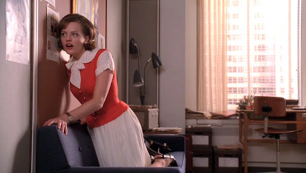 She wore this outfit before, most memorably the first time she slept with Duck. The blouse is slightly different this time. It’s a perfect little working-girl outfit of the period and it looks like it cost her some money. Of course she’d still have it in rotation a couple of years later.