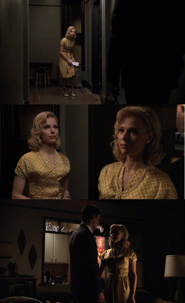 She wore this during her scene with Sally, when Don tried to cast her in the role of surrogate Betty. She’s definitely been recast in the Betty role here, as she puts everything of herself aside for Don, who just cheated on her. Note again the hair, which is back to a Betty-like bounce and curl, rather than her previous Faye-like straight bob.