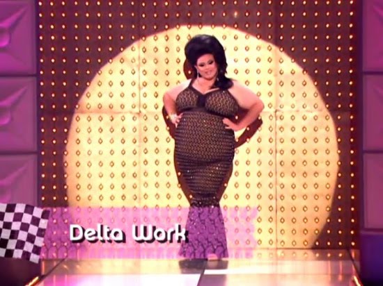 Her performance was funny, but we have to admit, we didn’t realize until she walked out on the catwalk looking like an extreme version of her that her name is a play on Delta Burke’s. Love the dress and wig.