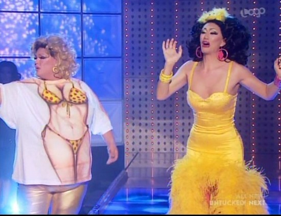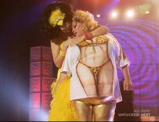 Although we hope next week Manila points out to her what a stereotype her ghetto pimp and ho character was. Shangela has a lot of nerve giving her shit for her Asian stereotypes.