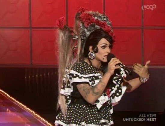 Ironically, this is the softest her face has ever looked on the show. Even her Tyra was harder looking than this. Even knowing beforehand she was doing a Carrie look, we still gasped when she walked out. As a performer, she was engaging. Except for the Dad line, she wasn’t exactly knee-slappingly funny, but she connected with the audience and they seemed to enjoy the performance. This is why she’s a contender. She’s a seasoned performer and a natural in front of a crowd. It was interesting to see the almost orgasmic rush she got afterwards. That’s someone who lives to perform. Some viewers seem to think she’s mean-spirited, but we don’t find her any more so than a great many of the other queens and besides, we’ll say it again and again: throwing shade and reading for filth are long-standing drag queen traditions. For a lot of these gals, this is just another form of performance. And that goes for Shangela too. In fact, there’s a distinct possibility, given their pre-RPDR history, that this whole rivalry between these two is nothing more than a long-term performance that they’re both in on. We wouldn’t be a bit surprised.