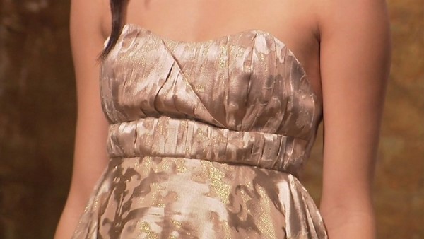 The Scoop ladies were polite about it and tried to look for compliments, but the second this walked out it was all over. It’s a cute design. Nothing we haven’t seen before, but it would fit on the Scoop rack. The problem is, it’s so obviously a mess. This ain’t Project Runway. You can’t hope you’ll get by with some pins and shitty seams but no buyer is going to consider you after looking at this.