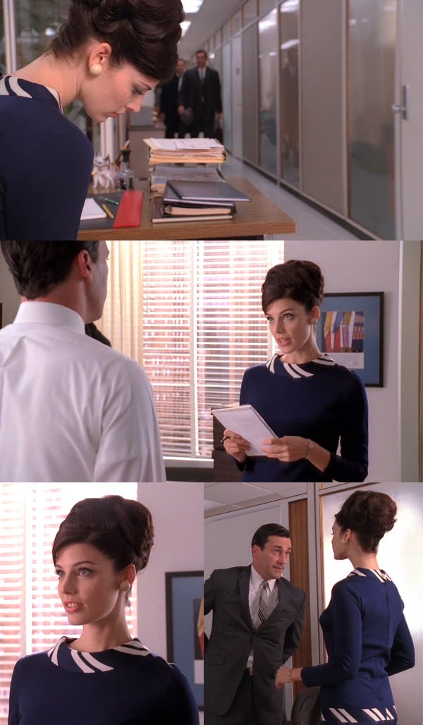 The tension in this episode was sky high by the time it got to the Drapers’ story and that feeling was enhanced by Megan’s outfit. She wore this outfit once before, the Monday after she threw Don his surprise party, when they entered the office and walked down that hallway, tense and barely speaking or looking at each other (a moment and shot which will be replicated later in the episode).