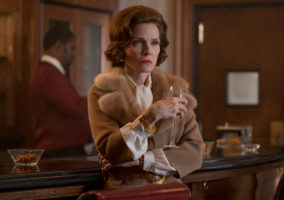 Which is when Lane and Pete wound up fist-fighting in the conference room over Lane’s desire to be involved in the Jaguar account and the partners’ resistance to the idea. Joan is in a blue dress with a bright green flounce at the neckline and Peggy’s in blue and yellow, just like their 1968 outfits. But things are reversed this time, as Peggy does the shushing and Joan becomes the partner trying to land an account and causing Pete to blow up.