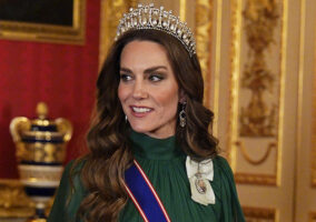 Meghan Markle: Emporio Armani Single Breasted Coat | Cartier ‘Galanterie’ Diamond Stud Earrings | Birks Stackable Snowflake Ring | Lorraine Schwartz Emerald-Cut Diamond Ring | Princess Diana’s Gold Cartier Watch | Aquazzura ‘The Purist’ 105 Pump