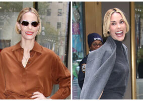 We don’t know if she was coming from another press event or an actual holiday party, because she wore something entirely different on the show, but even if this was just a walking-in look, it’s fun. The green looks great on her and the python print keeps it from looking too holiday-cliche. Having said that, we’re glad she didn’t wear it inside.