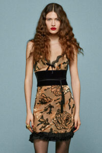 Roberto Cavalli Brown Velvet Semi Sheer Mini Dress with Velvet Floral Print Design and Black Lace Trim from the Pre-Fall 2025 Collection