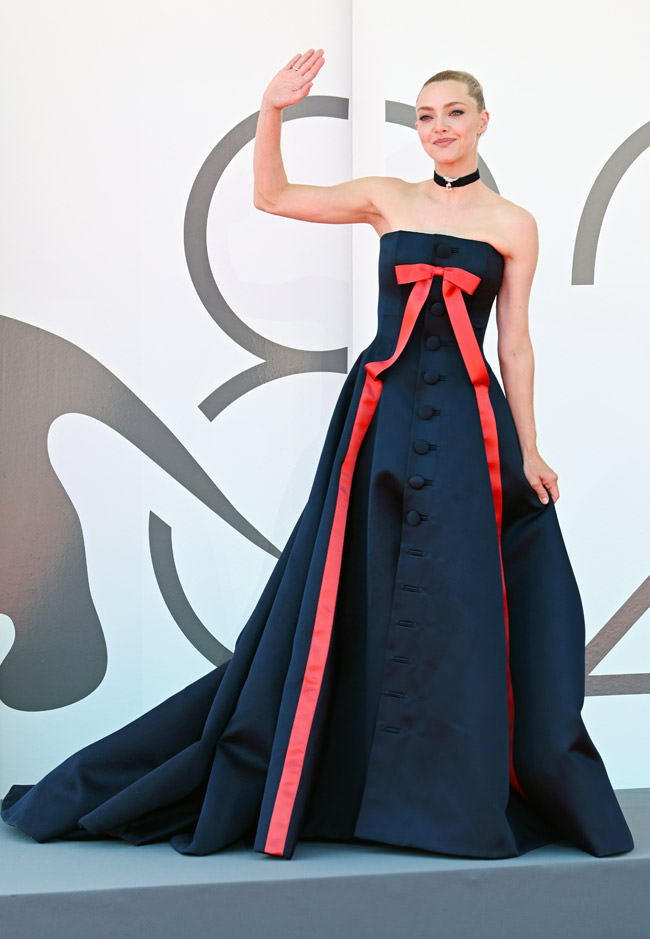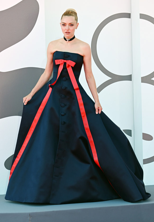 But fine, here are the deets we should have put in the opener: Amanda Seyfried came to the Venice Film Festival to premiere her musical about the founder of the Shaker movement (no, really) The Testament of Ann Lee, and we’d say her choice of outfit for the occasion indicates she’s planning for a vigorous awards season. Normally, we’d put this up for a vote, but as we said, we’re flush and we’ve got another frock planned for that treatment later. Besides, we don’t think there’s much to debate here. Either you love that sad wreath bow or you loathe it. We know which side we come down on. Aside from that detail, we actually love the design, which borrows quite literally from ecclesiastical vestments, which is pretty ironic, given what she’s promoting. Putting aside our automatic dislike of bows in fashion, and the fact that this one is so sad and craftsy, it’s the way it’s incorporated into the skirt that tips it over into awful for us. The brooch choker is beautiful and while we don’t think the slick hair is the best choice for her, it’s a good choice for this look. Really, if she’d just ripped the bow off, we’d love this.
