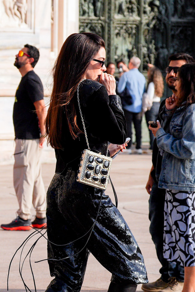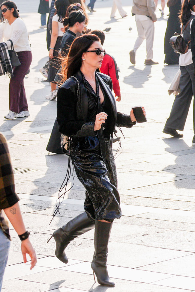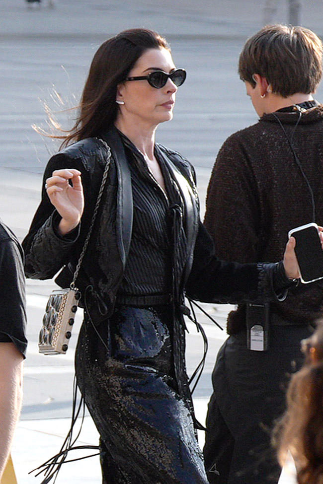 It’s kind of a gorgeous look — or at least, it’s a look with a lot of gorgeous pieces. Like so much of the costume design that we’re seeing in this film, it just looks like too much. We’ve said this before but it bears some repeating: the top fashion editors, when they’re out doing fashiony sorts of things, do not wear trendy or attention-seeking fashion 99% of the time. It’s all classic pieces and the vibe tends to be more businesslike than hit-the-club. To be fair, we have no idea what Andy is doing in this film, but the original had a “freeing herself from the horrible world of fashion” ending (which we had all sorts of problems with), so it feels like a step backwards for the character that she’s back in this world again. To be fair, that’s true of all sequels. We’re just a bit concerned that this one is going to fall into the And Just Like That… trap of turning all of the characters into two-dimensional drag queens.