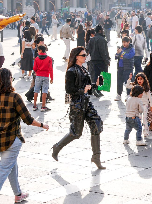 Anne Hathaway was spotted at the Piazza Duomo in Milan while filming The Devil Wears Prada 2 in yet another inappropriate-for-sunlight ensemble.
