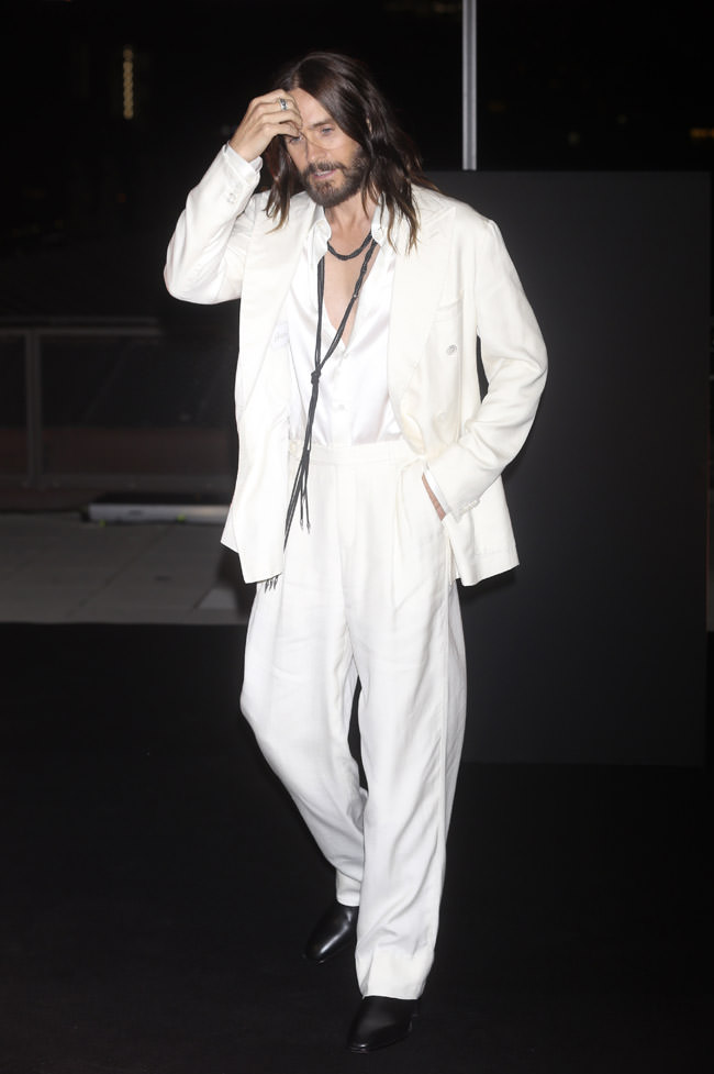This is fine. We’re certainly not mad at it. It plays to the whole rocker Jesus thing he likes to cultivate. We’ve drawn a comparison to Johnny Depp before but part of the reason Jared’s schtick still works for him, aside from the lack of aging which allows him to pull it off, is that he knows how to strip it down to its bare minimum when he wants to. He can be really pretentious with his style, but he rarely overdoes it.