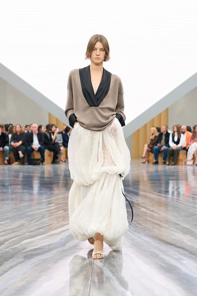 And our thoughts can be summed up as “These pieces should break up immediately.” We get that the top and skirt walked the runway together, but we really can’t see how they coordinate well. One is extravagant and floaty and formal and the other is casual and sporty. The more we look at it, the more we really dislike that top. The cuffs and the collar look like they were pinned on at the last minute as attempts to jazz up what is essentially a sweatshirt. We hate tiered skirts but this one is kind of pretty. The shoes are gorgeous.