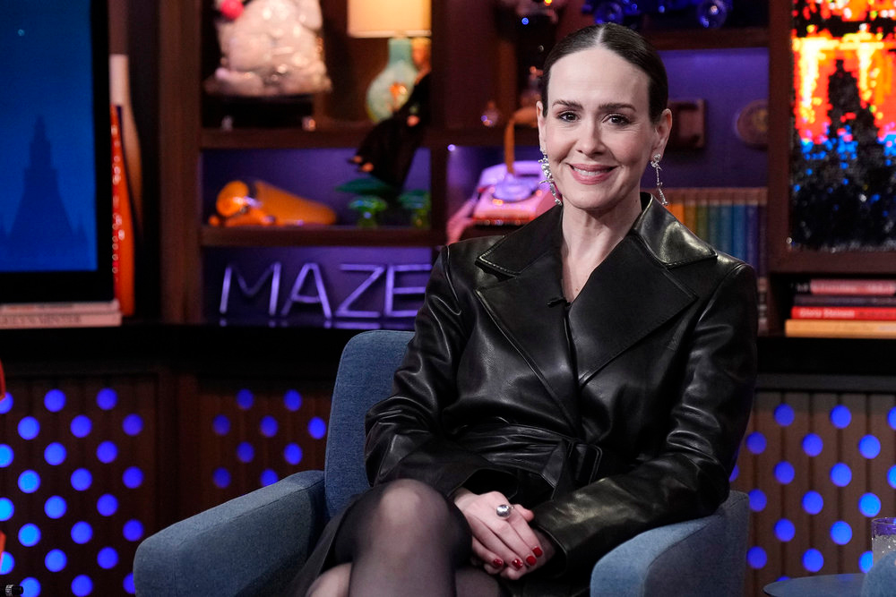 Bitches that we are, we admit to a certain amount of glee in hearing the news that Ryan Murphy is getting positively trashed by the critics over his latest paper doll drama, All’s Fair. That tacky queen has had this reckoning coming for some time now and it appears that the stunt casting of one Kim Kardashian has set many critics’ teeth on edge. Not that we’re clapping hands over her fellow actresses getting bad reviews, but most of what we’ve read seems to start from the assumption that everyone in the cast (except for Kim) deserved better. Sarah Paulson has been getting the best reviews, but that’s no surprise, since she’s been working with Murphy the longest and knows exactly how to approach his work. For her visit to Andy Cohen’s clubhouse, she wore the classic “I don’t read the reviews” sort of look: armored up and serious as shit.