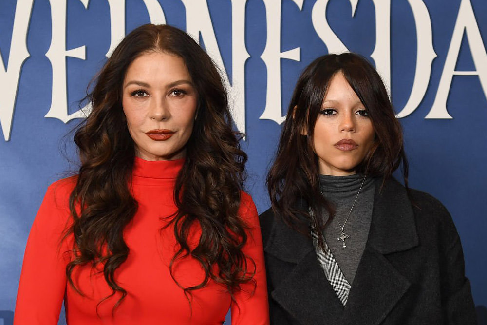 Wednesday stars Catherine Zeta-Jones and Jenna Ortega had a little fake mother-daughter bonding time as they asked folks to consider their little show for some awards consideration. The looks were simple and almost businesslike, with nary a hint of cosplay to them.