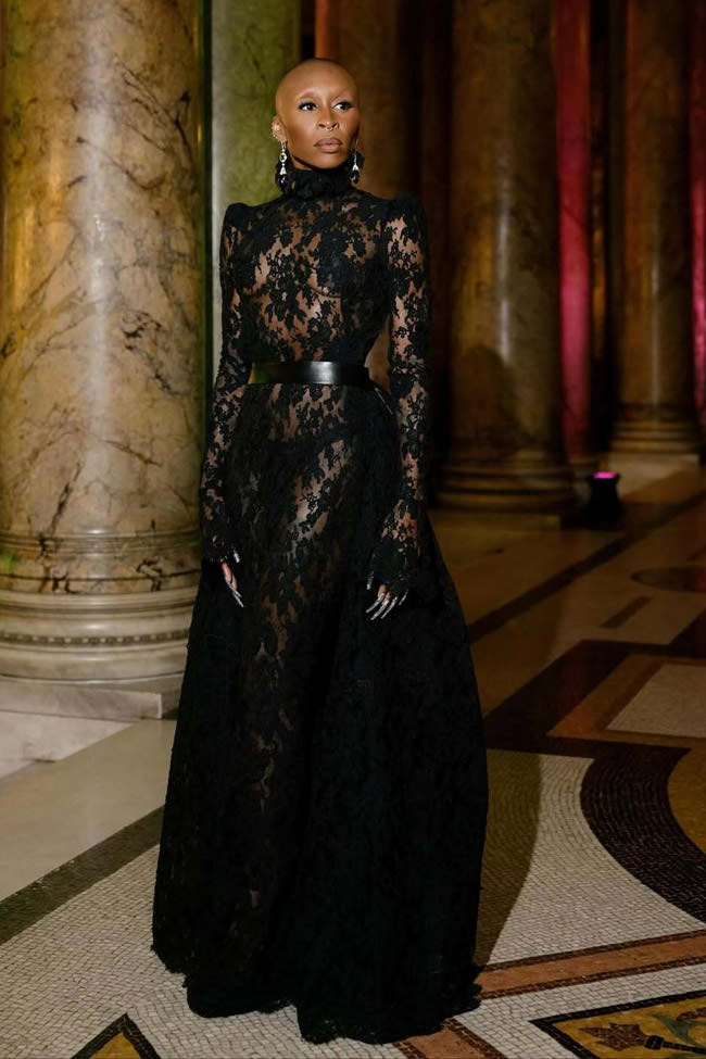 Cynthia Erivo: Custom Givenchy Open-back Black Lyon Lace Gown with a Bustle Skirt and Black Leather Detailing | Chopard Jewelry