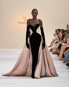 – Tamara Ralph Silk Velvet Strapless Gown with Pale Pink Silk Double Duchesse Overskirt and Black Invisible Tulle Overlay Paired with Black Stretch Velvet Opera Gloves from the Fall 2025 Couture Collection