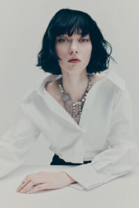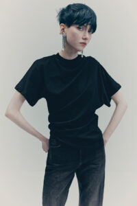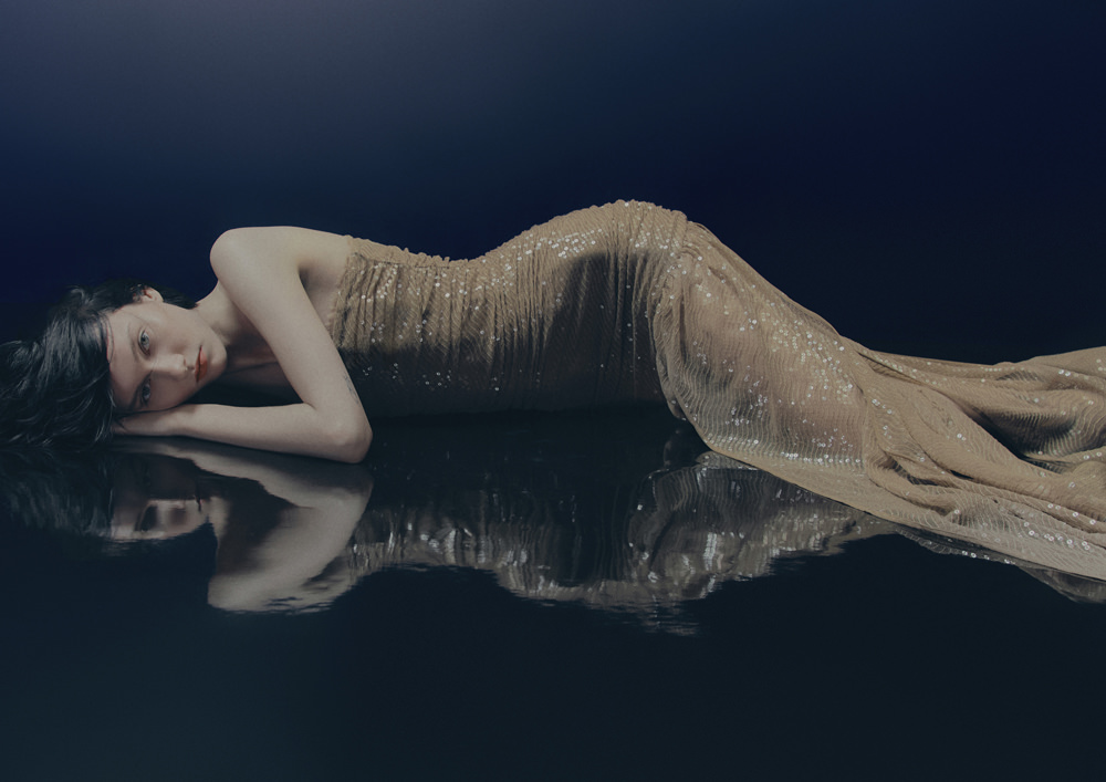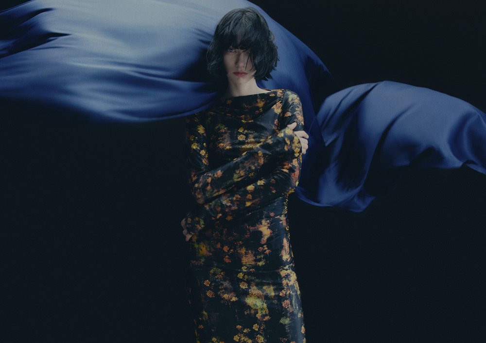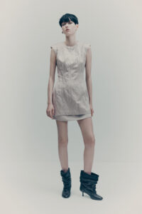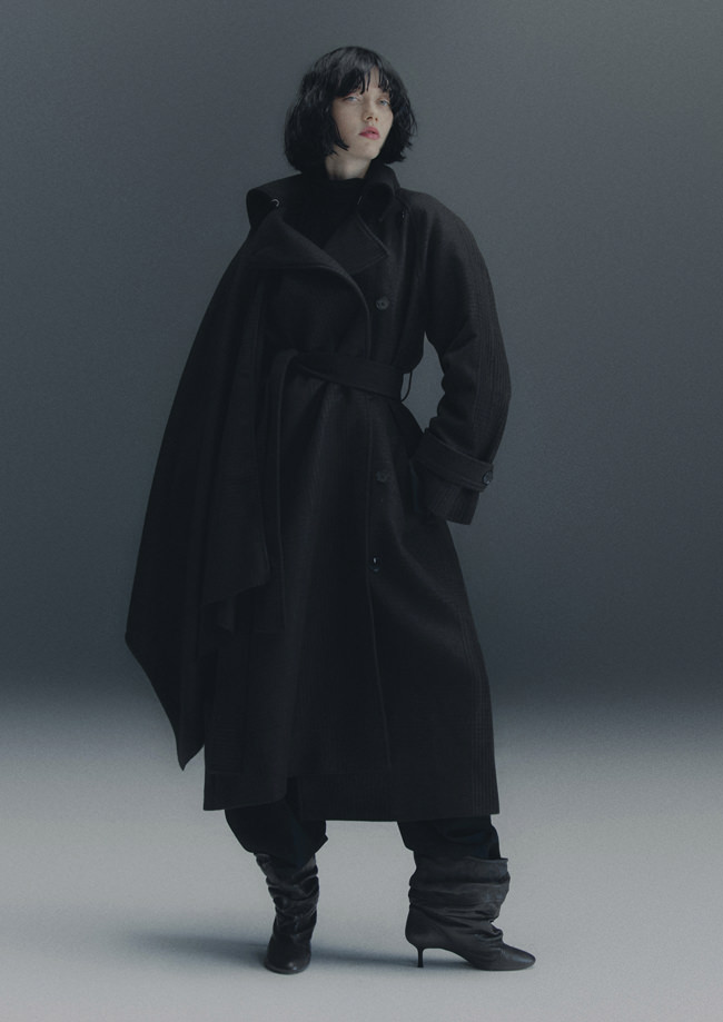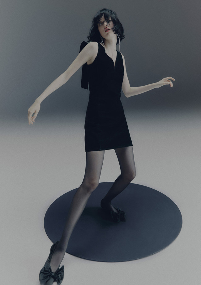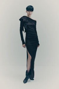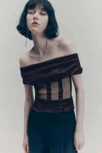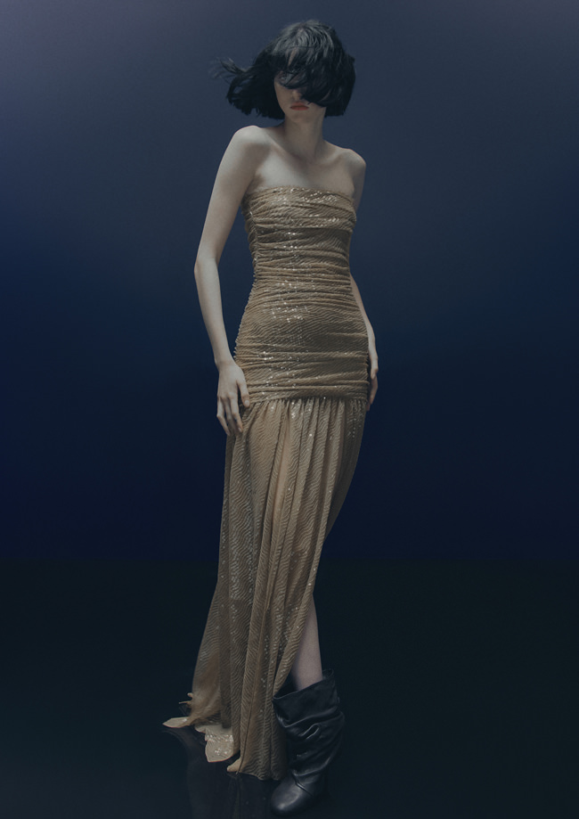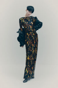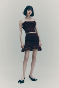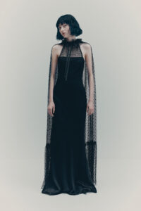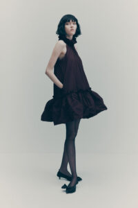 The colour palette is decadent yet refined with black, dark chocolate brown, deep burgundy, beige, white and a pop of acid yellow. Materials include washed leather, lightweight taffeta, sheer sequins, heavy cotton, jacquards and mesh fabrics. The key pieces have an air of nostalgia but are always grounded in contemporary design twists. Like the strong black tuxedo featuring a cropped blazer and high-waisted trousers with open slits on the back. Or the voluminous cape in black polka dot mesh with a high ruffled collar and deep ruffled hem over a sleeveless black dress with intricate draping – a two-in-one creation. And for a glittering ‘wow’ moment, there’s a beige sequinned mesh bandeau dress with spectacular ruching across the body.