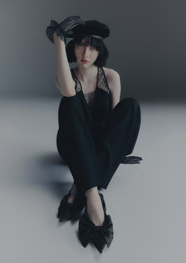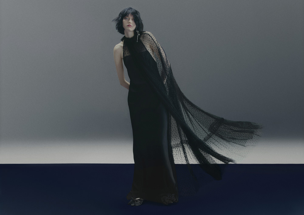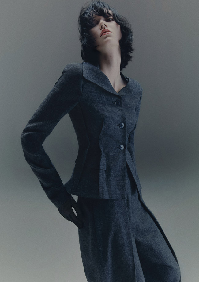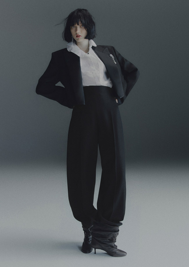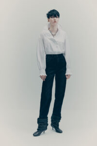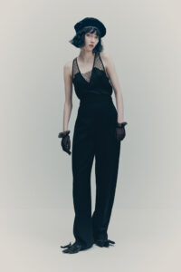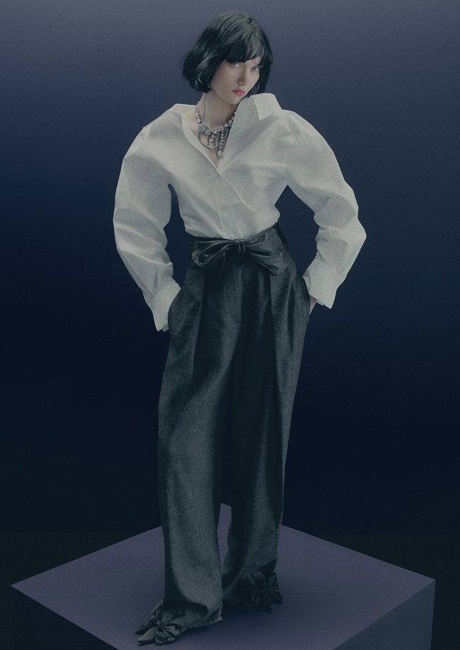 Shirting is also vital to the season. The classic white tuxedo shirt has been reimagined with a wide-open collar and cut-out shoulders to show off statement necklaces or earrings. A white ruffled high-collar shirt adopts the tuxedo bib front and deep cuffs. Meanwhile, outerwear comes in the form of a brown-black long wool belted coat in a blown-up check pattern with a separate scarf attachment and a cropped black washed leather jacket that takes cues from a trench. Accessories push every look, from black washed satin kitten heels with oversized bows and dark chocolate brown boots with a wide draped leather shaft to black lace gloves with ruffle hem, multi-strand necklaces and a beret in washed velvet denim.
