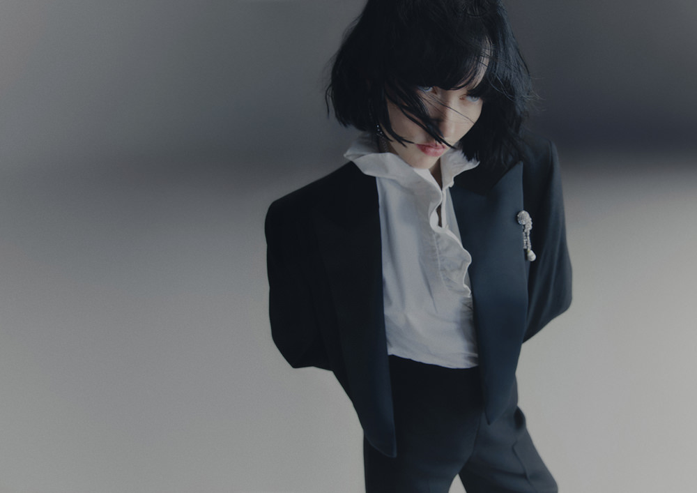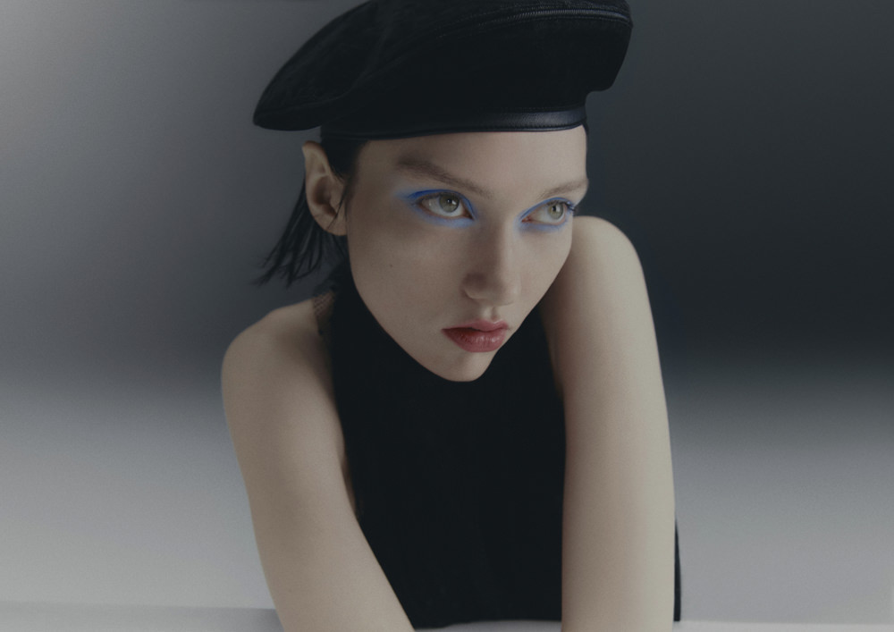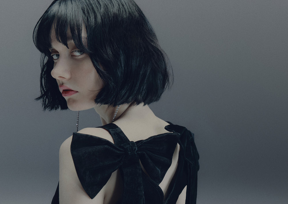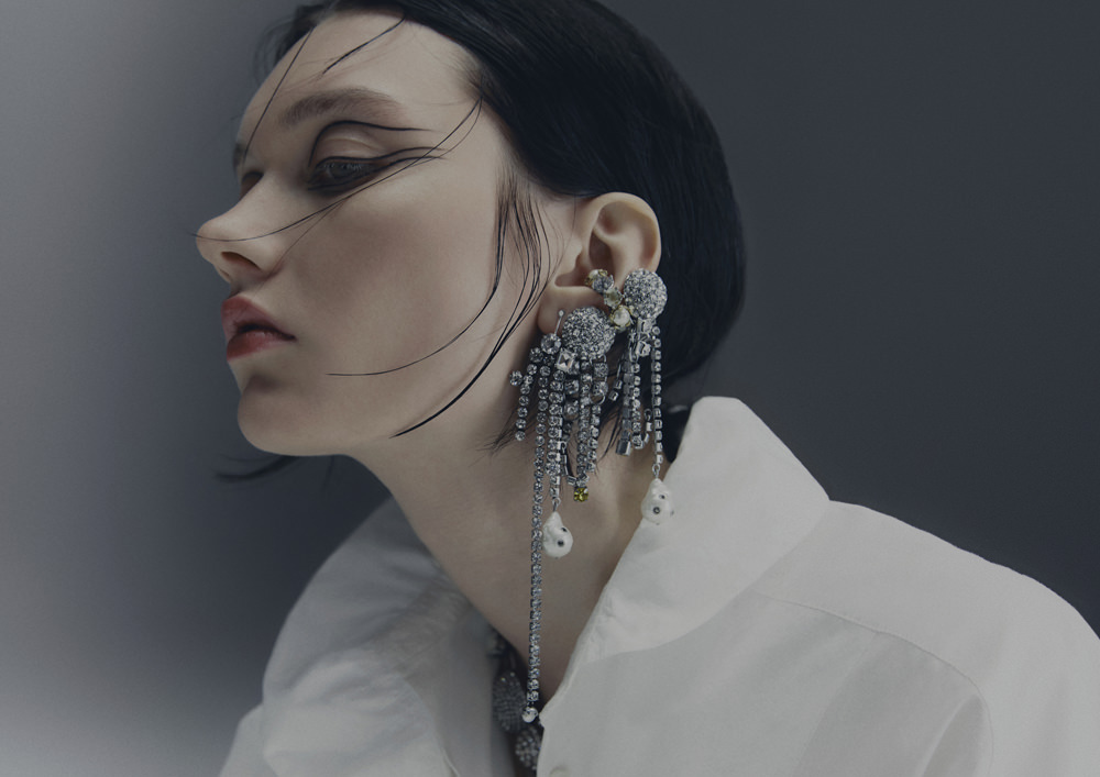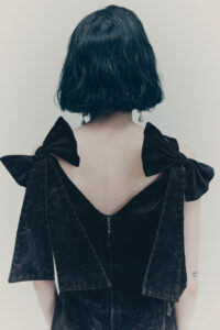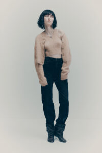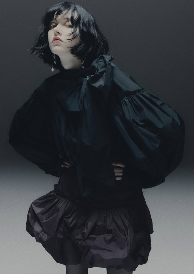 Shirting is also vital to the season. The classic white tuxedo shirt has been reimagined with a wide-open collar and cut-out shoulders to show off statement necklaces or earrings. A white ruffled high-collar shirt adopts the tuxedo bib front and deep cuffs. Meanwhile, outerwear comes in the form of a brown-black long wool belted coat in a blown-up check pattern with a separate scarf attachment and a cropped black washed leather jacket that takes cues from a trench. Accessories push every look, from black washed satin kitten heels with oversized bows and dark chocolate brown boots with a wide draped leather shaft to black lace gloves with ruffle hem, multi-strand necklaces and a beret in washed velvet denim.