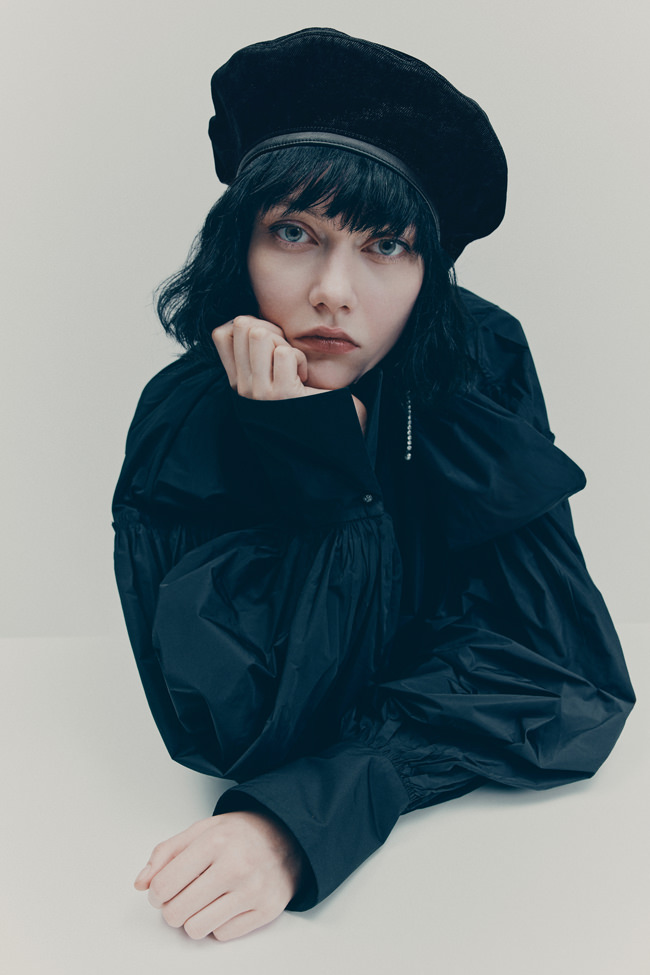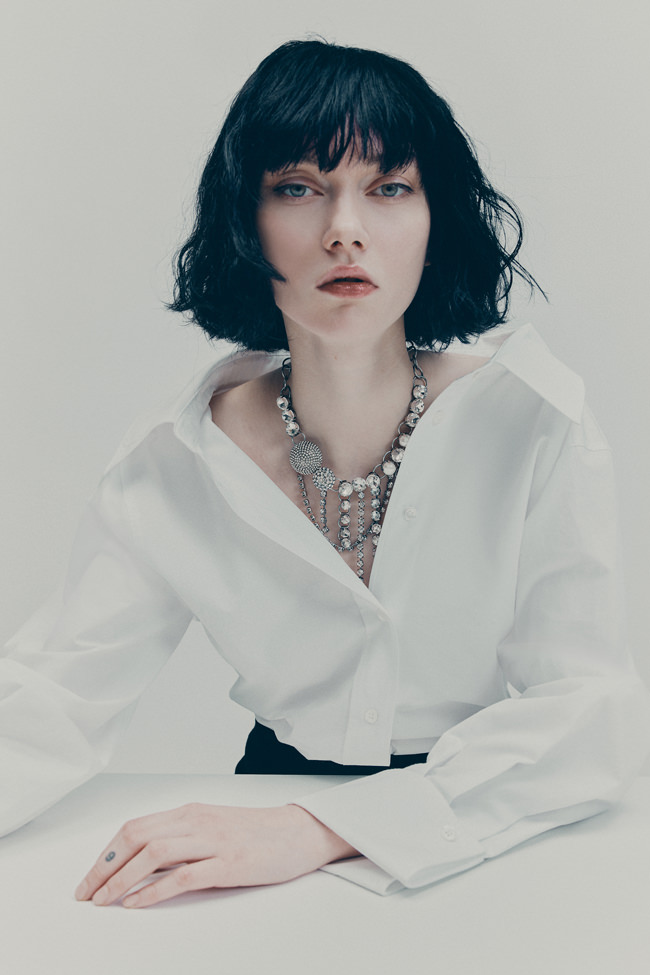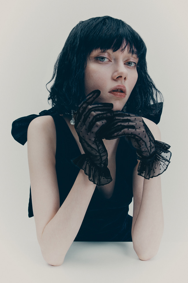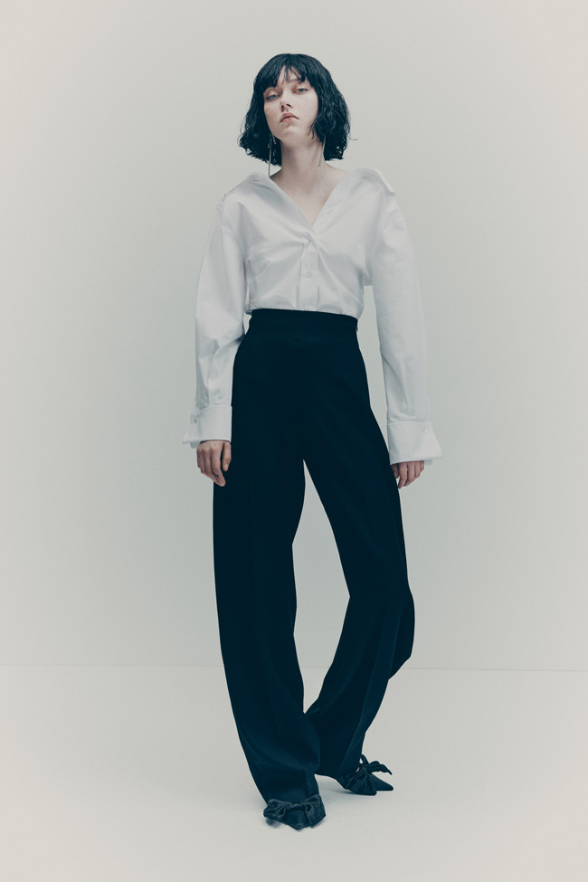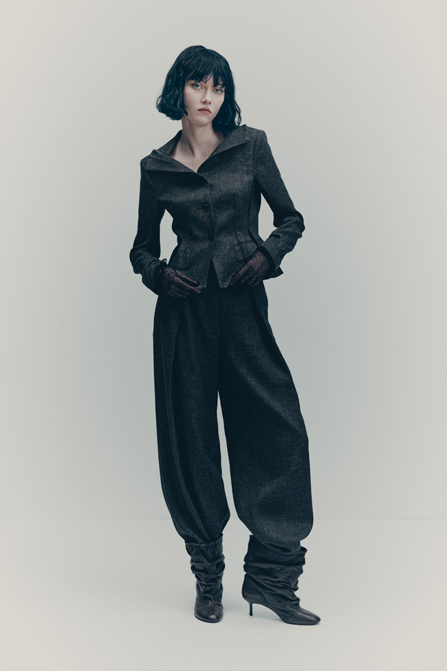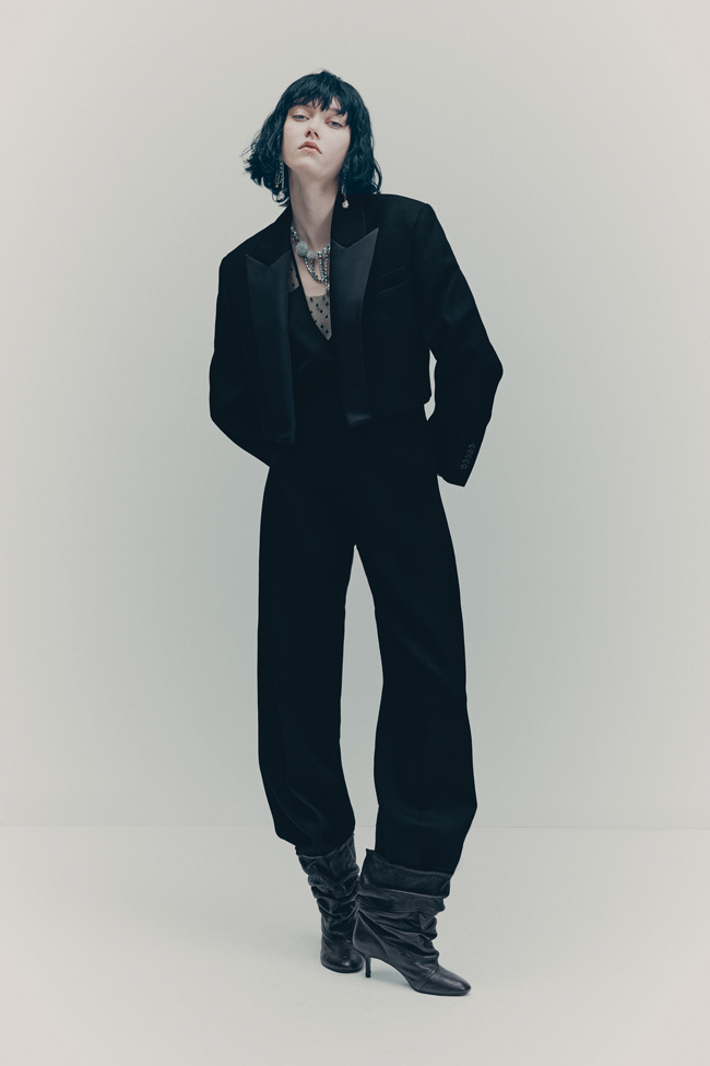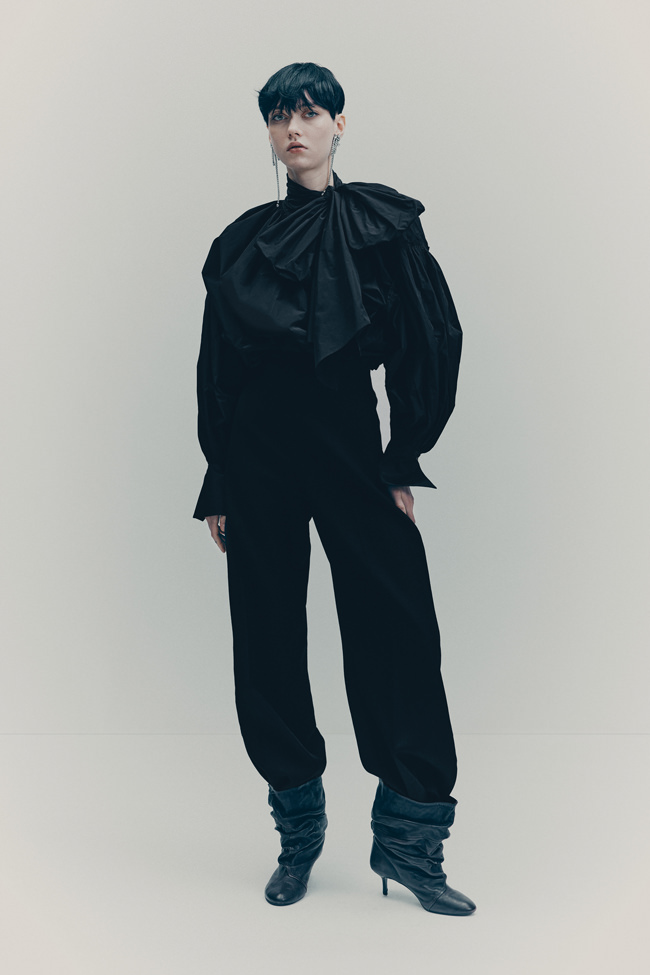 Shirting is also vital to the season. The classic white tuxedo shirt has been reimagined with a wide-open collar and cut-out shoulders to show off statement necklaces or earrings. A white ruffled high-collar shirt adopts the tuxedo bib front and deep cuffs. Meanwhile, outerwear comes in the form of a brown-black long wool belted coat in a blown-up check pattern with a separate scarf attachment and a cropped black washed leather jacket that takes cues from a trench. Accessories push every look, from black washed satin kitten heels with oversized bows and dark chocolate brown boots with a wide draped leather shaft to black lace gloves with ruffle hem, multi-strand necklaces and a beret in washed velvet denim.