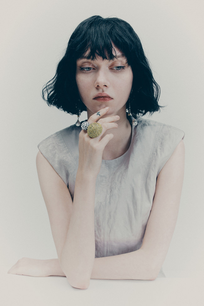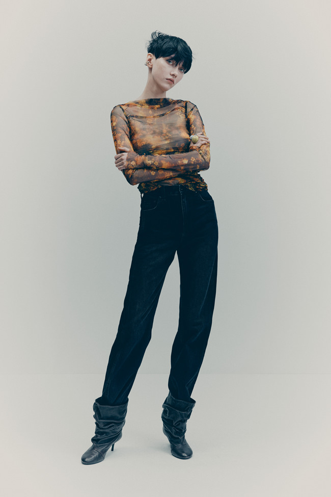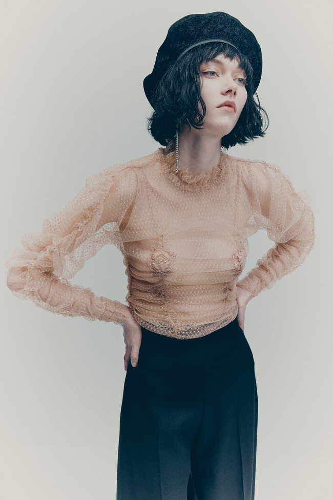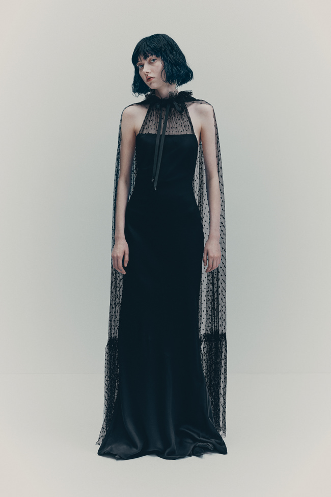 The colour palette is decadent yet refined with black, dark chocolate brown, deep burgundy, beige, white and a pop of acid yellow. Materials include washed leather, lightweight taffeta, sheer sequins, heavy cotton, jacquards and mesh fabrics. The key pieces have an air of nostalgia but are always grounded in contemporary design twists. Like the strong black tuxedo featuring a cropped blazer and high-waisted trousers with open slits on the back. Or the voluminous cape in black polka dot mesh with a high ruffled collar and deep ruffled hem over a sleeveless black dress with intricate draping – a two-in-one creation. And for a glittering ‘wow’ moment, there’s a beige sequinned mesh bandeau dress with spectacular ruching across the body.