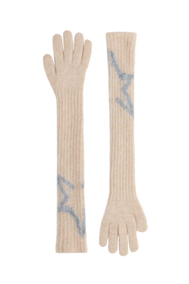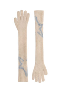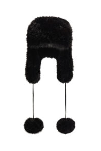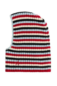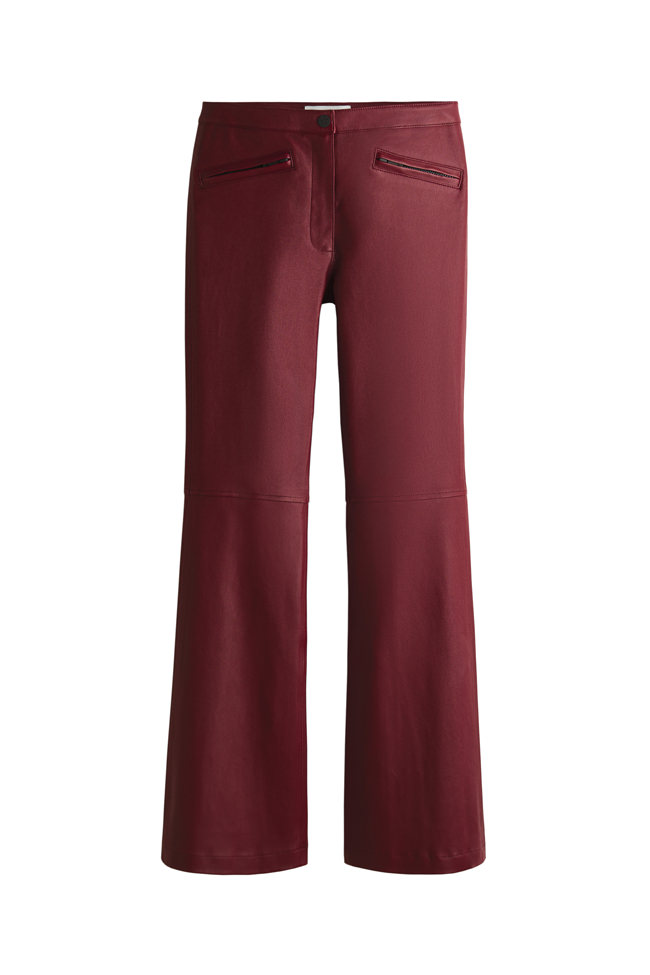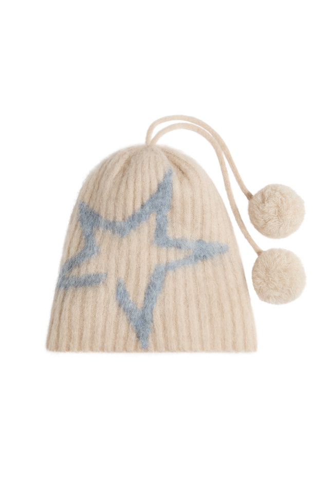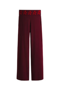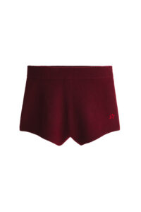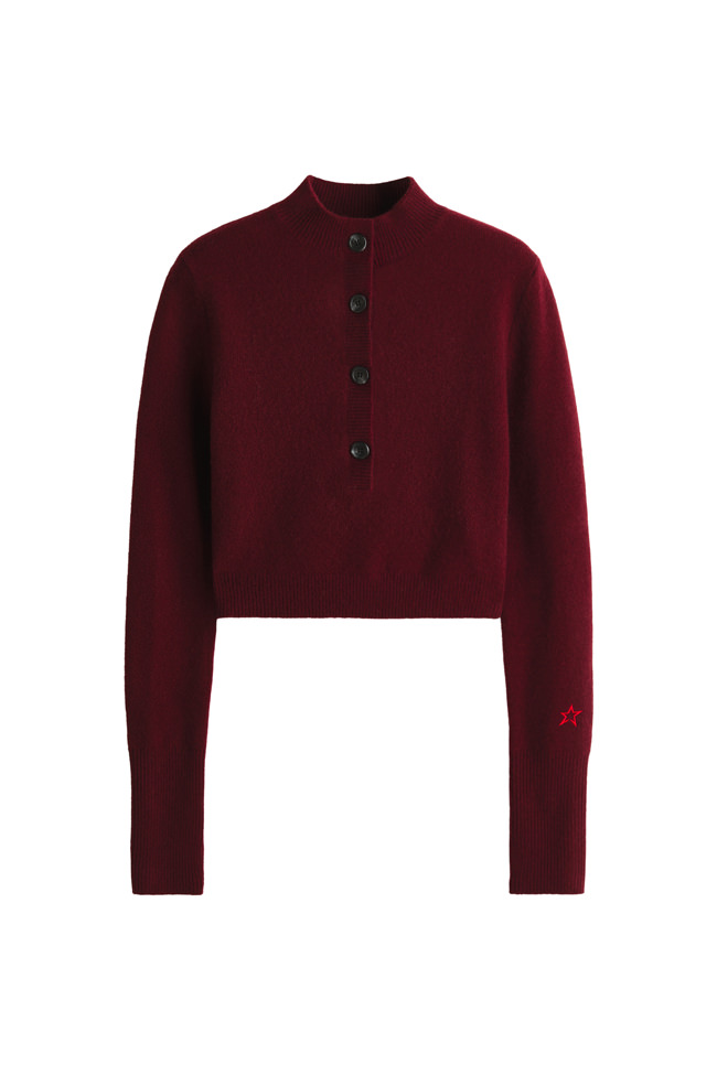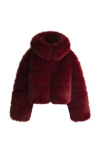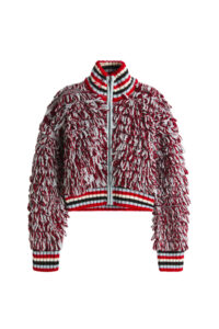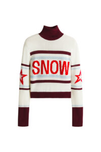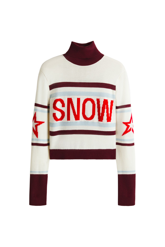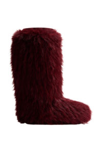 Key pieces include a burgundy faux fur down-filled puffer jacket with a hood that hits just above the hips, a black and white star-print puffer jacket with a jacquard belt, burgundy leather trousers based on ski pants with a subtle bootcut and zips up the calves, a loop knit cardigan with striped knit trims, and a matching burgundy knitted set of button top and shorts. For accessories, there are faux fur tall moon boots, padded short moon boots, hats with pom-poms, wraparound sunglasses and an oversized star-print wool and mohair scarf.