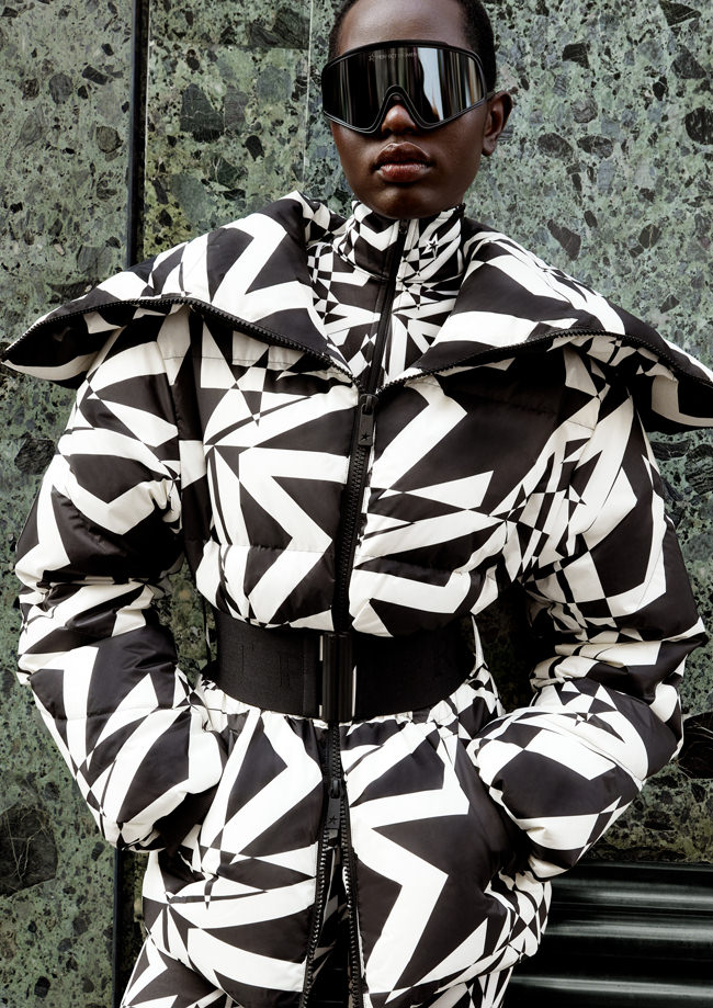The 28-piece capsule features down-filled outerwear, striking separates, knitwear and winter-ready accessories that exude fierce glamour. The designs are a nod to Perfect Moment’s performance-led skiwear, while the mix- and-match approach means the collection can go from the chalet to the city in a flash.