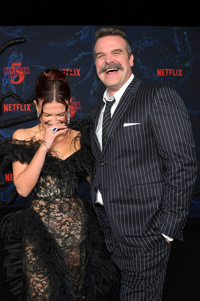 Millie Bobby Brown (in Rodarte) and David Harbour