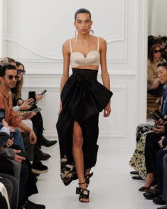 But it almost works. The skirt is gorgeous and we love the unexpected choice of the boots with it. We tend to think the style is not friendly for a sit-down interview, if only because of all the volume it adds around the waist. This is a skirt for standing and posing. The bra top is simply awful. The skirt design doesn’t allow for a lot of leeway in terms of what kind of top you can pair with it. It seems that a crop top or a very simple shell are just about the only options available.
