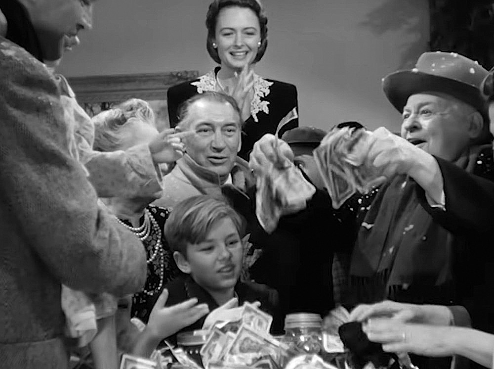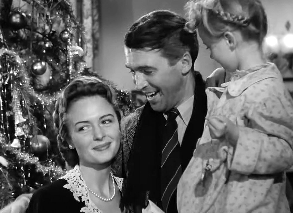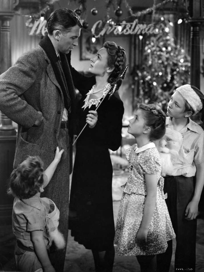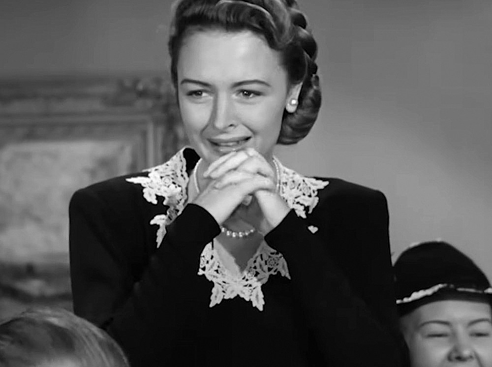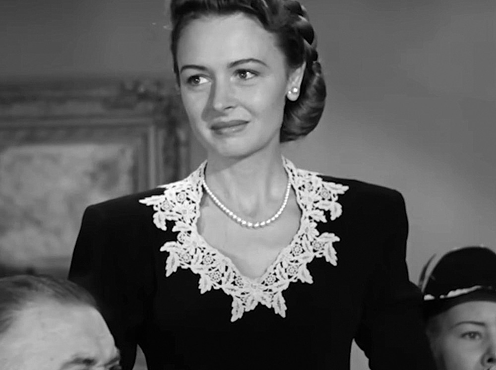It’s a simple black knit dress that speaks to her frugality as the wife of a struggling businessman, not to mention a woman in an America just beginning to recover from wartime rationing. The lace collar speaks of the sorts of traditional, conservative, middle-class values the film espouses while also signaling her status as a wife and mother, as does the somewhat mature hairstyle, which differentiates her from the younger version she played earlier in the film. The pearls are the one concession to the evening, a bit of dressup for a Christmas Eve that turned out quite differently than the one she had planned. She’s beautiful, traditional, maternal, and supportive, with just a touch of glamour; the perfect post-War American wife in the perfectly appropriate holiday dress.
