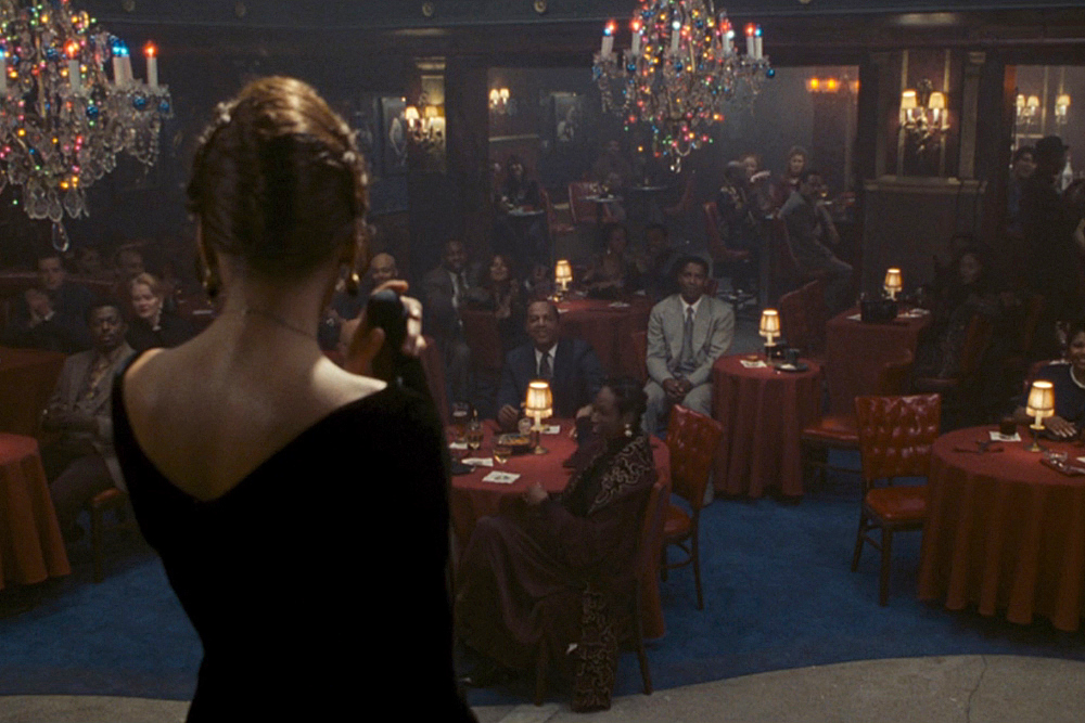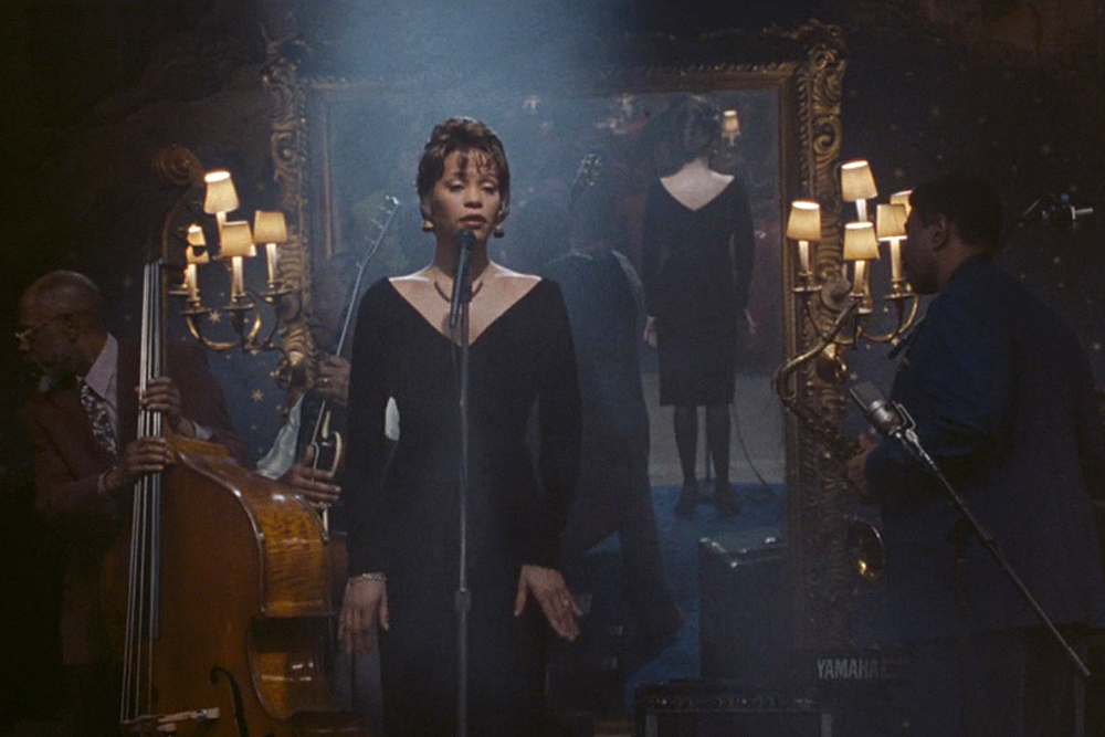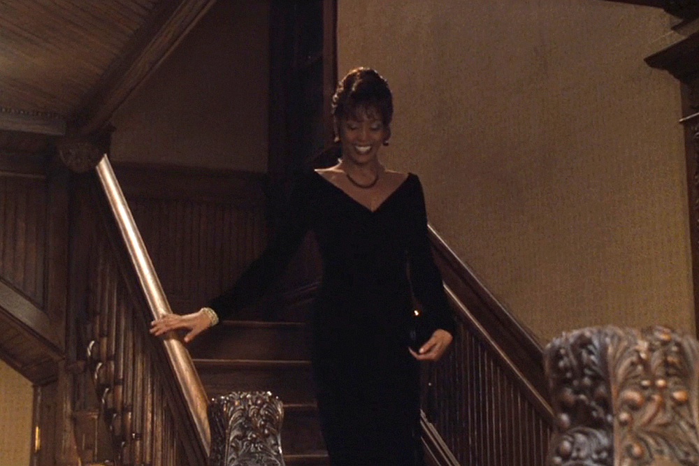 Yesterday, a depressed and horny holiday lady! Today, a faithful and soulful Christmas wife. In The Preacher’s Wife, directed by Penny Marshall, Whitney Houston took over the role Loretta Young played in the original film, 1947’s The Bishop’s Wife. In it, she plays Julia, the wife of preacher Courtney B. Vance, dutifully standing by her husband as choir director while he goes through a crisis of faith while faced with the potential closure of their church. God sends them Dudley, an angel in the form of Denzel Washington, who immediately ingratiates himself into the bemused family. Seeing that their marriage is under considerable strain, Dudley convinces the preacher to take his wife out to a jazz club, just like the old days. At the last second, he’s forced to leave because of a parishioner’s health issues, leaving Julia to come down the stairs in her finery, ready for a night of fun.