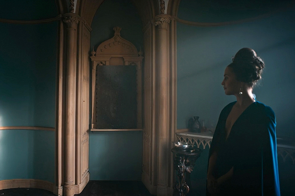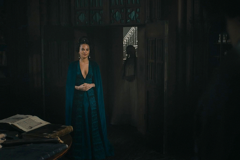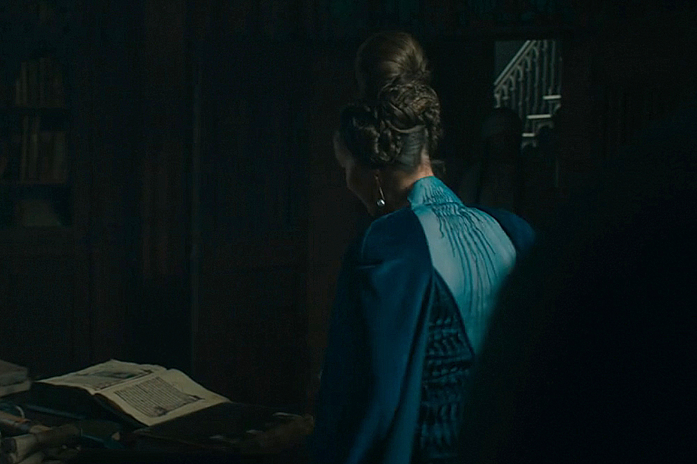Costume designer Malgosia Turzanska did absolutely stunning work in this film and we’d go so far as to call it some of the very best cinematic costume design of the last decade. She understood that an Arthurian tale doesn’t have to owe a single thing to historical accuracy and freed herself from any such concerns as to how a high-born lady in roughly seventh Century England would have dressed. There’s no embroidery and the techniques used to render this garment are closer to haute couture than anything made 1500 years ago. The point is not to be historic, it’s to be mythic. The Lady sets about seducing and enticing Gawain while the Lord enters into a strange agreement with him that Gawain would share anything he received while in his house in return for his hospitality. Again, all of this is wrapped up in teal, which permeates every scene in this scenario. There are no servants in the house, which forces the question of how the Lady even manages to get dressed or get her hair done. The only other occupant is a silent, blind old woman who stands or sits in judgment of the happenings around her.
