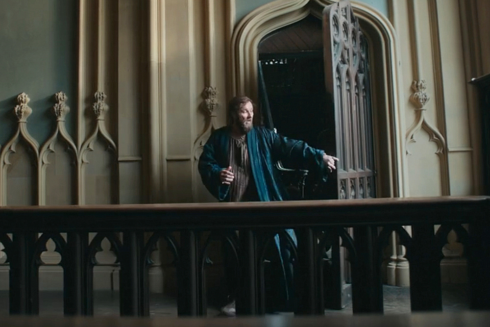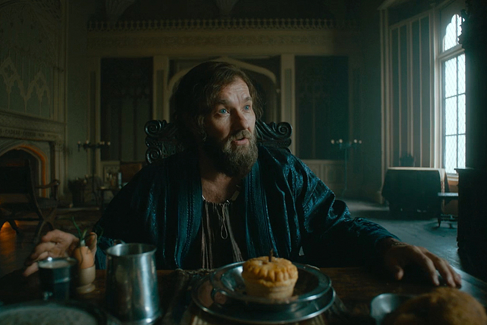 We’re starting with this screencap for a reason. When he awakes, he meets the Lord of this castle, played by Joel Edgerton, who takes him downstairs to a waiting breakfast, where he informs him that it’s only a few days until Christmas, the Green Chapel is less than a day’s ride away, and he’s welcome to stay and rest up until he needs to complete his quest: