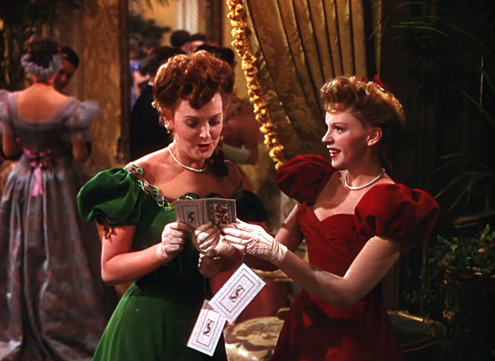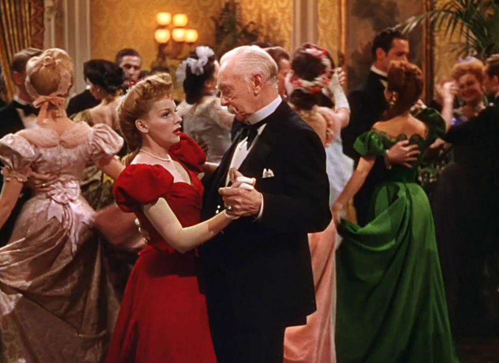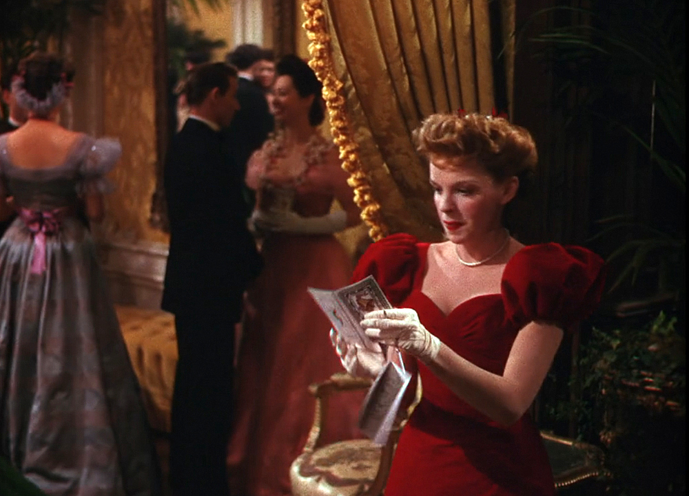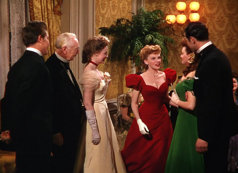 Yesterday, a holiday bullshit artist! Today, a would-be social butterfly. This is it! T Lo’s favorite Christmas movie dress and Lorenzo’s least favorite Christmas movie (he can’t stand Margaret O’Brien)! In director Vincent Minnelli’s Meet Me in St. Louis, Judy Garland plays Esther, the second-oldest of a quartet of Smith daughters in Saint Louis in 1903. The film follows the family throughout the year, as the oldest daughters each scheme to land a beau and the younger daughters engage in mild psychopathy and property damage. The story culminates at the Christmas Eve ball, where Esther and her sister Rose (Lucille Bremer) try to go all mean-girl on the girl who who showed up with Rose’s would-be suitor. In the meantime, Esther’s beau — do we really need to go on? As if anyone reading this post doesn’t know the film? Anyway, here she is, the absolute Princess of Christmas Eve.