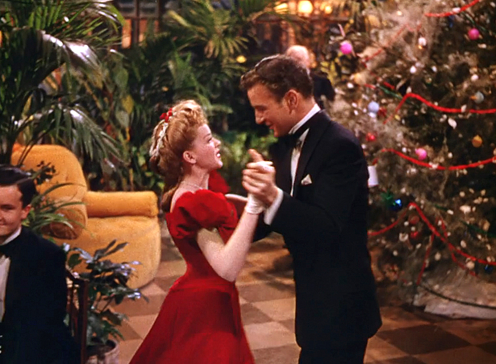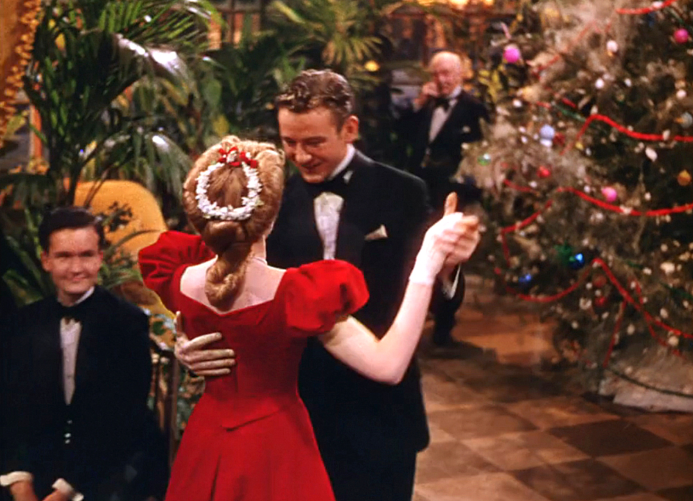As we’ve noted a time or two before, red dresses in Christmas movies inevitably get paired with or square off against someone in a green dress. The temptation to do so has to be overwhelming and costume designer Irene Sharaff opted to just go with it. Just look at this perfect trio of Christmas belles. One screencap tells you exactly what time of year it is.