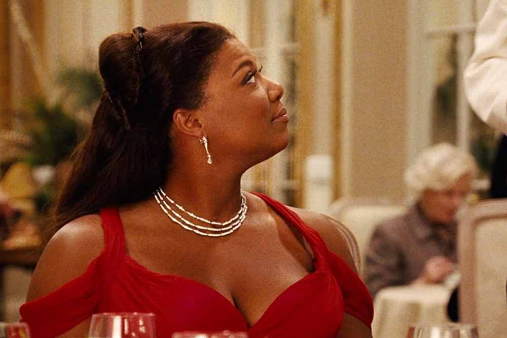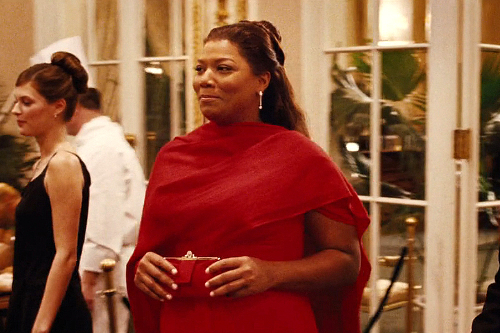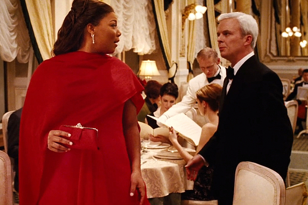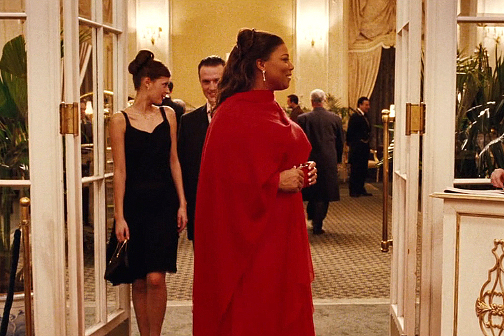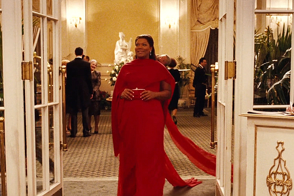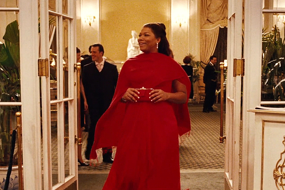 Yesterday: A business-like Christmas queen! Today, a gal who’s all about treating herself well. Because sometimes, a good Christmas dress is just about looking drop-dead fabulous. In The Last Holiday, directed by Wayne Wang, Queen Latifah plays Georgia, a low-key and unassuming retail worker who discovers just before Christmas that she has a rare disorder that leaves her with only three weeks to live. Spoiler: this film is not a tragedy. In fact, this film couldn’t be a more straightforward piece of easily predictable fluff, but sometimes, that’s all you want from your holiday movie, areweright? Anyway, she gathers up what must have been a considerable amount of savings for a retail worker and heads off to Karlovy Vary in the Czech Republic for a final sojourn of holiday fabulousness before she gives up the ghost completely. After being referred to as “Ma’am,” she assess her own dowdy style and immediately heads to a local chic boutique and engages in that most traditional of rom com scenes, the “trying on outfits in front of a mirror while snotty salesgirls look on” montage, resulting in this gorgeous selection, which she triumphantly wears to dinner.