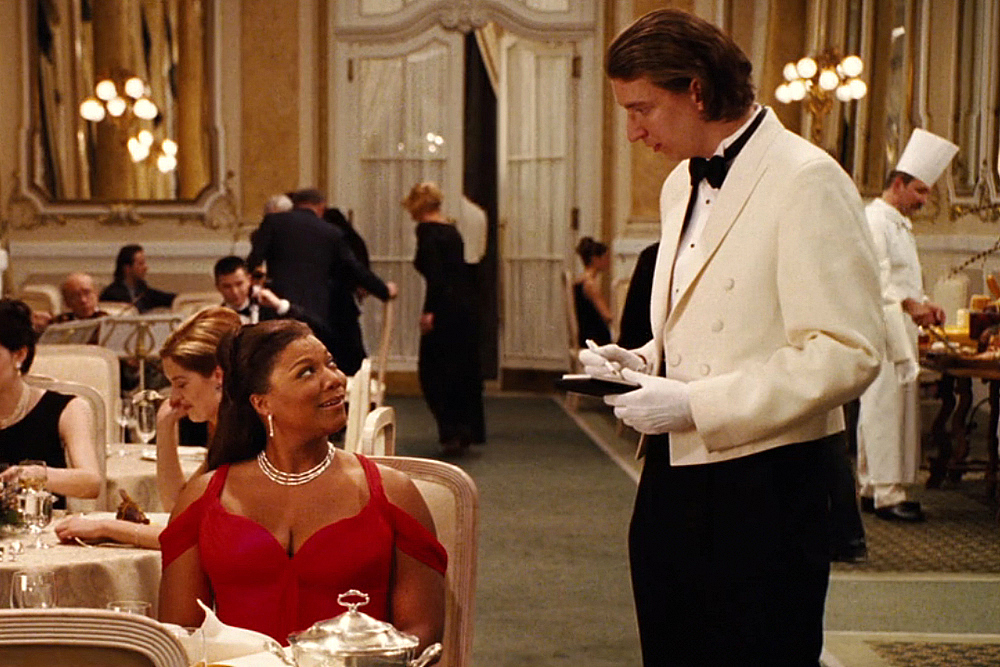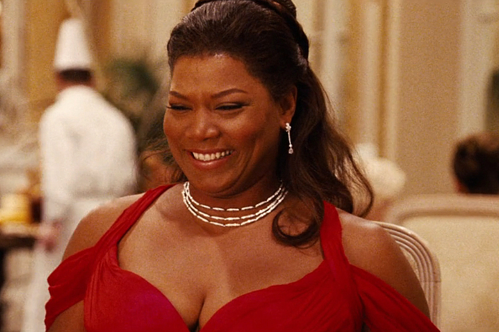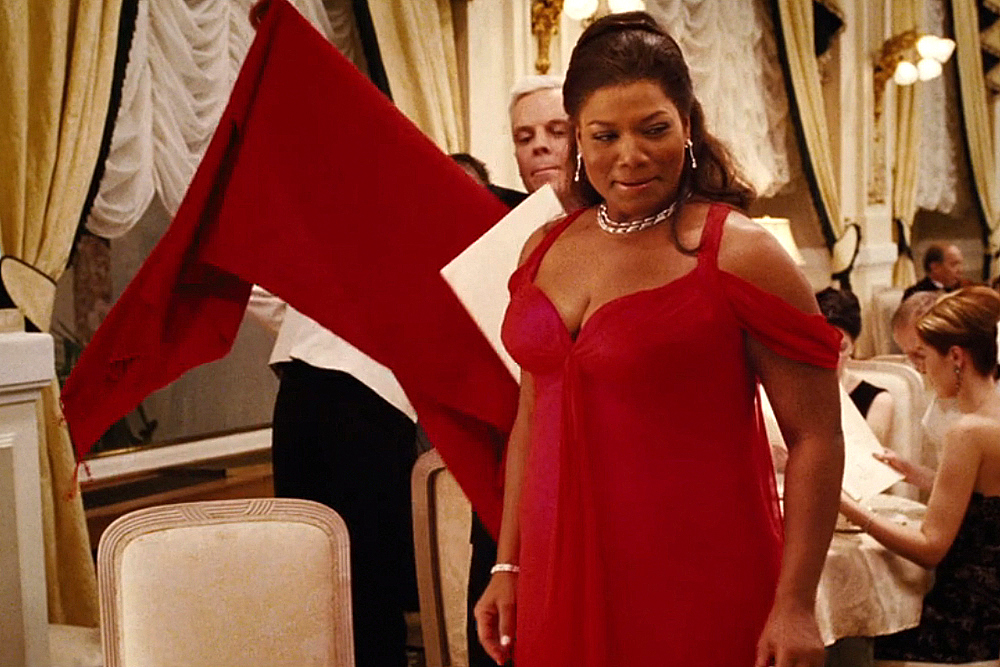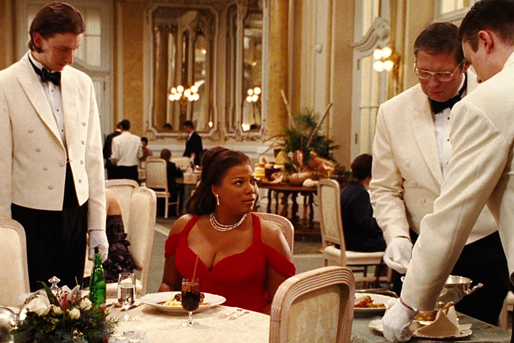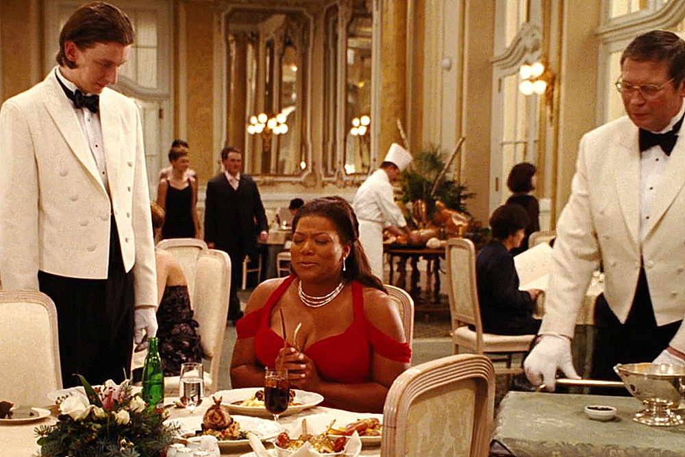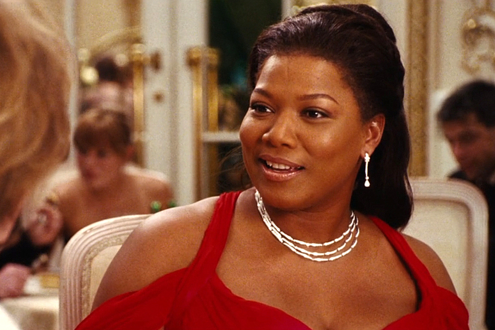 Yesterday: A business-like Christmas queen! Today, a gal who’s all about treating herself well. Because sometimes, a good Christmas dress is just about looking drop-dead fabulous. In The Last Holiday, directed by Wayne Wang, Queen Latifah plays Georgia, a low-key and unassuming retail worker who discovers just before Christmas that she has a rare disorder that leaves her with only three weeks to live. Spoiler: this film is not a tragedy. In fact, this film couldn’t be a more straightforward piece of easily predictable fluff, but sometimes, that’s all you want from your holiday movie, areweright? Anyway, she gathers up what must have been a considerable amount of savings for a retail worker and heads off to Karlovy Vary in the Czech Republic for a final sojourn of holiday fabulousness before she gives up the ghost completely. After being referred to as “Ma’am,” she assess her own dowdy style and immediately heads to a local chic boutique and engages in that most traditional of rom com scenes, the “trying on outfits in front of a mirror while snotty salesgirls look on” montage, resulting in this gorgeous selection, which she triumphantly wears to dinner.