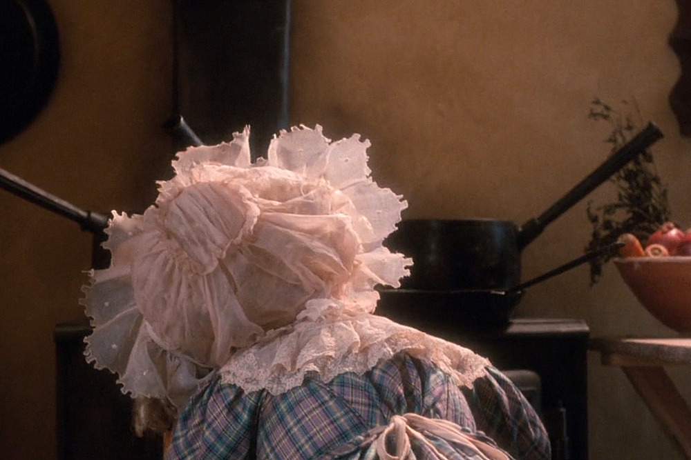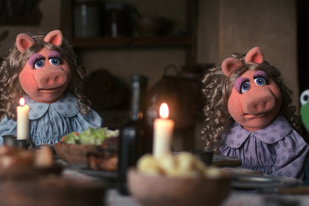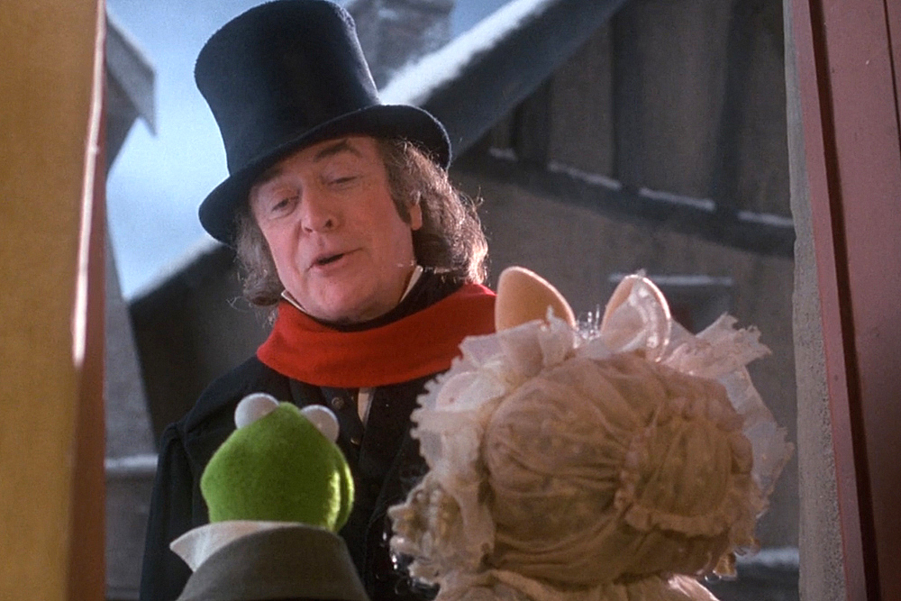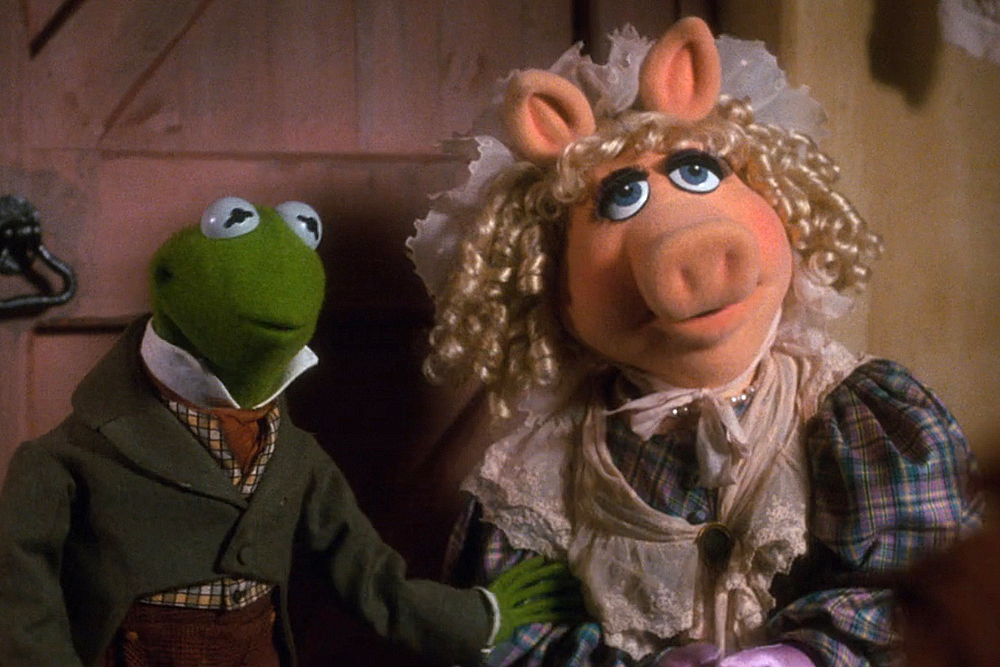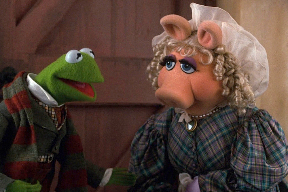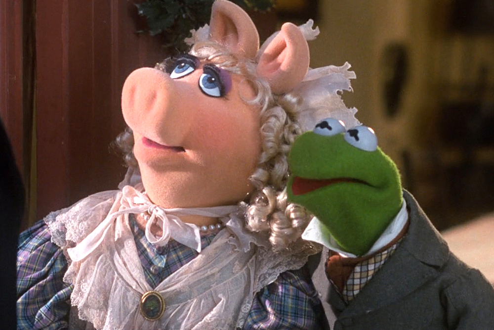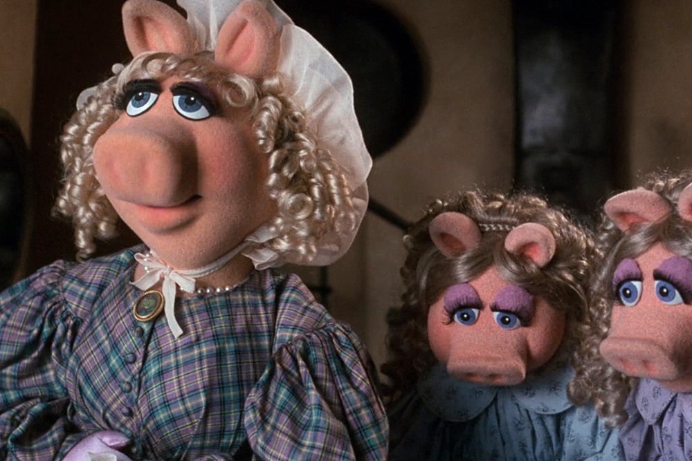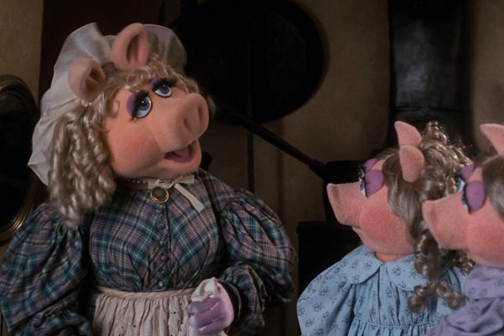 At least she gets to change out of her shawl and apron and put a nicer cap on her head. It would seem silly to try and devise any sort of hidden meanings from this costume. It’s a straightforward Victorian period piece, refitted for an anthropomophized pig and costume designers Ann Hollowood and Polly Smith accomplished that strange task very well. It’s notable to us that she’s in a blue-and-lavender plaid, which isn’t the most Christmassy color scheme, but it does coordinate well with Miss Piggy’s ever-present lavender satin opera gloves, which don’t actually make sense for the character of Emily Cratchit, but do make sense for this tirelessly fabulous diva. Also not making sense, that she and her daughters Belina and Belinda would be wearing matching eyeshadow, but again this is a film about characters playing characters. Of course Miss Piggy’s fictional daughters would be clones of her, in dresses to match her own. It’s best not to think too much about the historical accuracy of such things, just as it’s best not to consider the genetic trickery that allows the inter-species Cratchit family to exist at all.