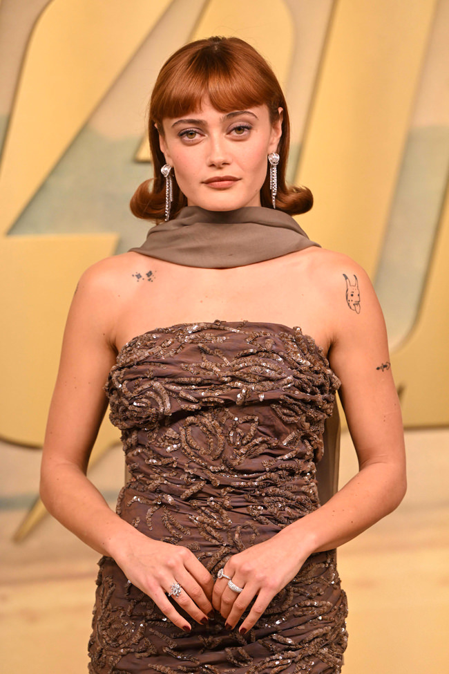We feel like, if you’re going to choose a brown cocktail dress for a red carpet, it better be one hell of a dress, not to mention a deeply flattering shade of brown. This just looks lumpy and awkward to us. The color does nothing for her. The scarf looks like a sad attempt to dress it up. The shoes and the earrings are fun. We don’t think that hair color or style does anything good for her.