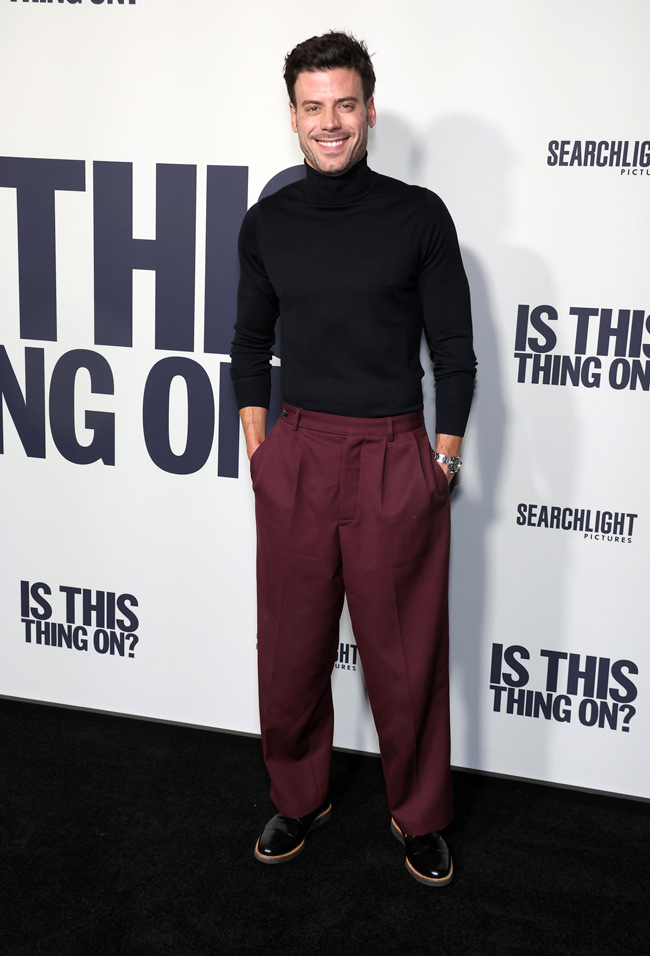 He fills out the turtleneck nicely, so we won’t complain about that, but the pants are kind of unflattering, no? Maybe a belt would help.