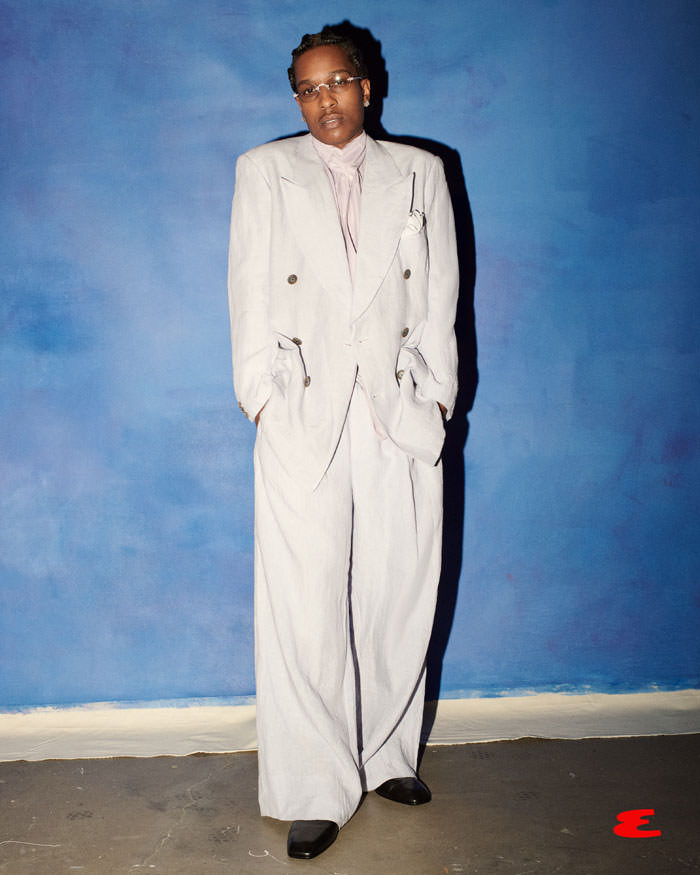 On his kids: “Man, I miss my kids,” Rocky reminds me, segueing to explaining how all his children are blessed with his good looks but that it’s too early to have a real sense of Rocki’s personality. To explaining that Rza is a picky eater but that Riot will eat whatever is sweet (maybe due to a hereditary sweet tooth), including his ecstatic first time eating cotton candy. To sharing, “Rza’s finally starting to stick up for hisself again, because Rza used to bully the shit out of Riot when Riot couldn’t walk and talk. Now Riot go take that boy book from him, take his pacifier.” To sharing, “Rza don’t be talking. That’s Riot. He can’t stop running his mouth.” To telling a funny story of how his loquacious boy snitched on him to Rihanna when he left the house without telling her. “He was like, ‘Dada left. Dada left through the door.’ She told me, ‘You left?’ I’m like, Yeah, why? She like, ‘Because our son told me you left. It’d been nice to say goodbye.’” Rocky confesses that he and Rihanna and the kids wore matching pajamas for Christmas but that the pictures won’t go public because he thinks it’s cringe. “That ain’t me. [The kids] gone know the difference. Ma dukes got to get thrown under the bus,” he says, half joking but also loath to fathom an instance when his kids will think him even an nth uncool.