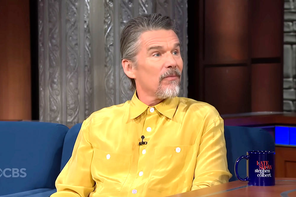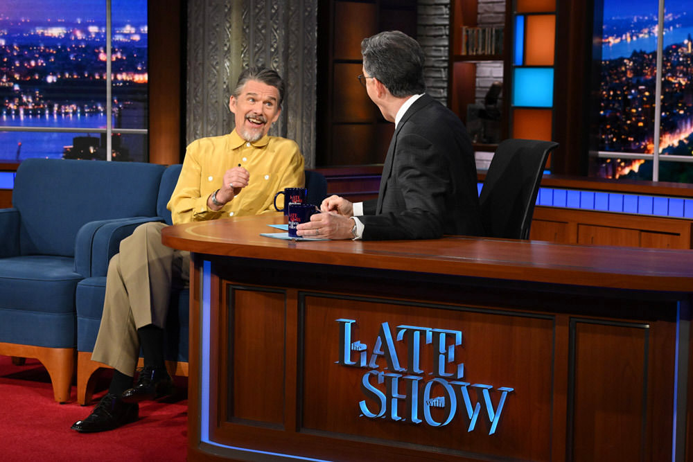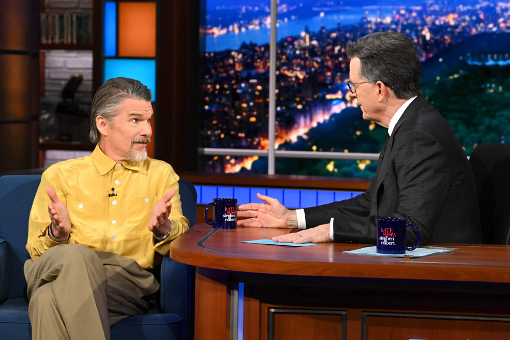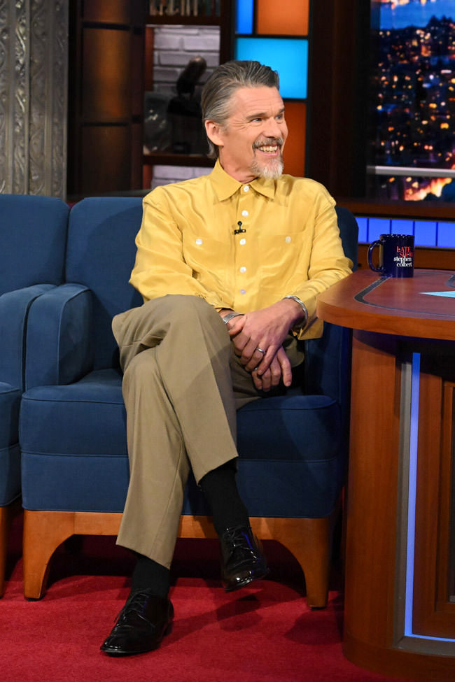 Ethan Hawke is getting awards buzz for his role in Blue Moon and he’s been diligently making his way through the promo rounds. We’ve always had the impression that he has a true Bohemian sense of style and that he can’t really express it as much as he’d like to in the kind of work he’s doing. He tends to either dress extremely quirky or very plain, which comes off to us like occasional bouts of expression surrounded by long periods of just getting the job done. He sort of split the difference for his appearance on Colbert: