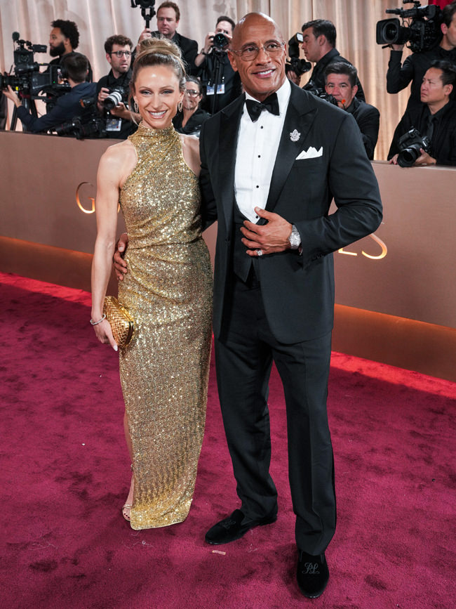 Gotta say, he looks stunning, although we’re not fans of velvet loafers with tuxes. Her golds clash and we don’t like the neckline at all.