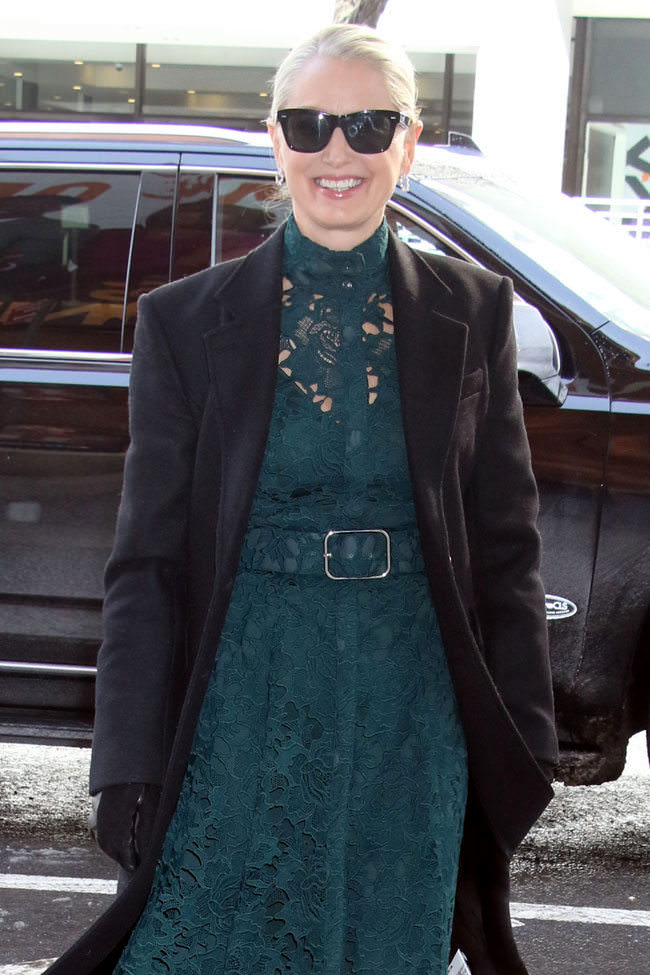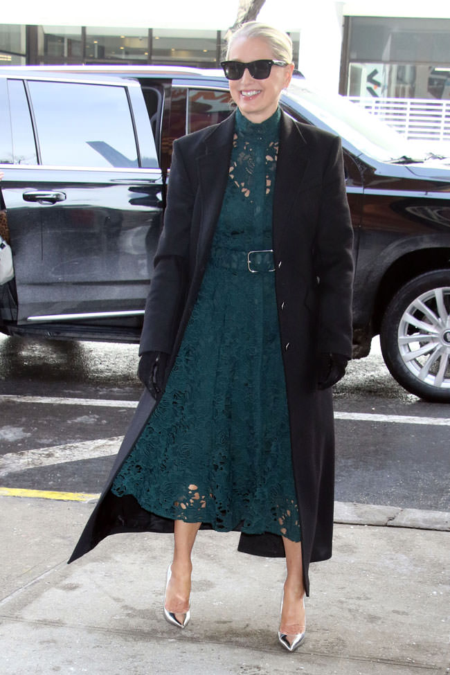We haven’t completely reversed our take on lace dresses, which is that they need to go away for a while, but we like this one for being in a rich color that suits her very well — and for being lined, of course. The pumps add a little pop of glamour that keeps the dress from coming off too mumsy. The only change we’d suggest is a black leather belt instead of that matching one. It’s a perfect day look for promotional work.